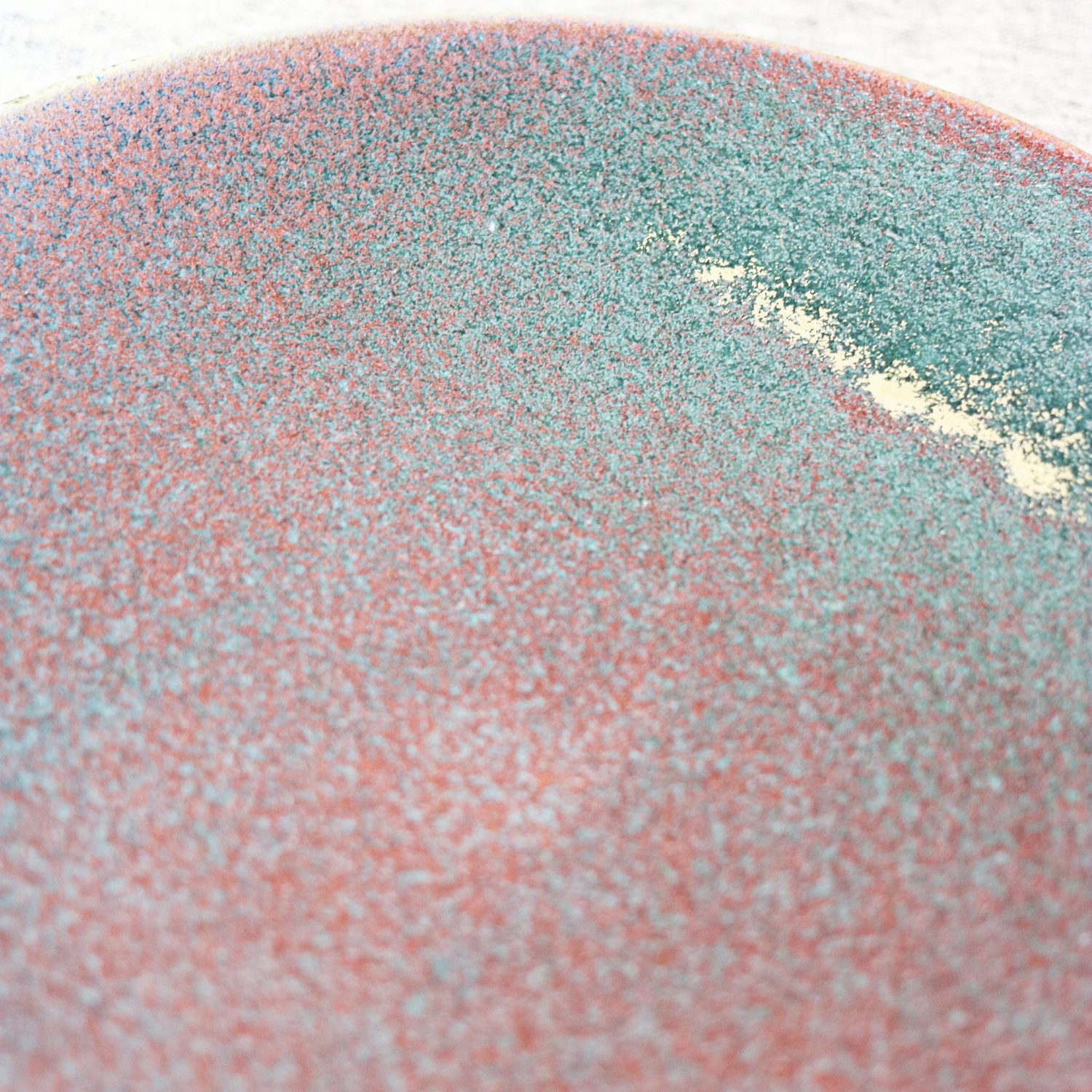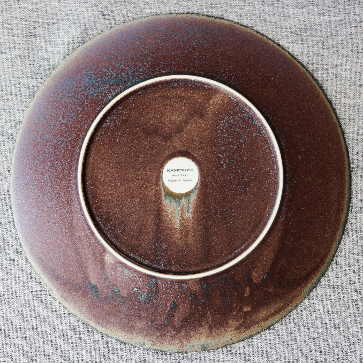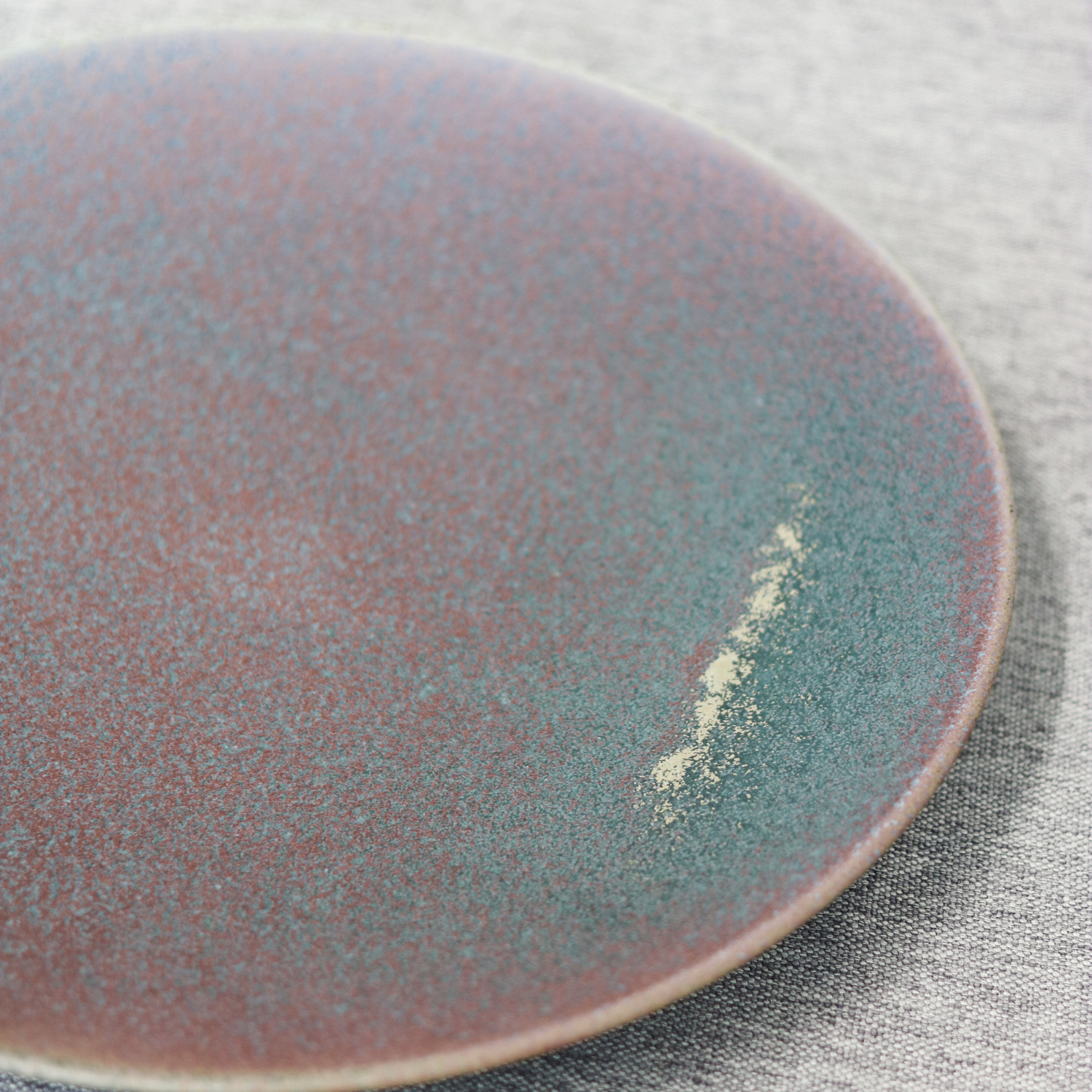 深みのある釉薬の色がにじみ合う独特の表情。このうつわはひとつひとつ異なる景色を楽しめるのが魅力です。赤みを帯びたブラウンを土台に青や緑が加わり、赤とも紫ともブルーとも定義できない発色です。