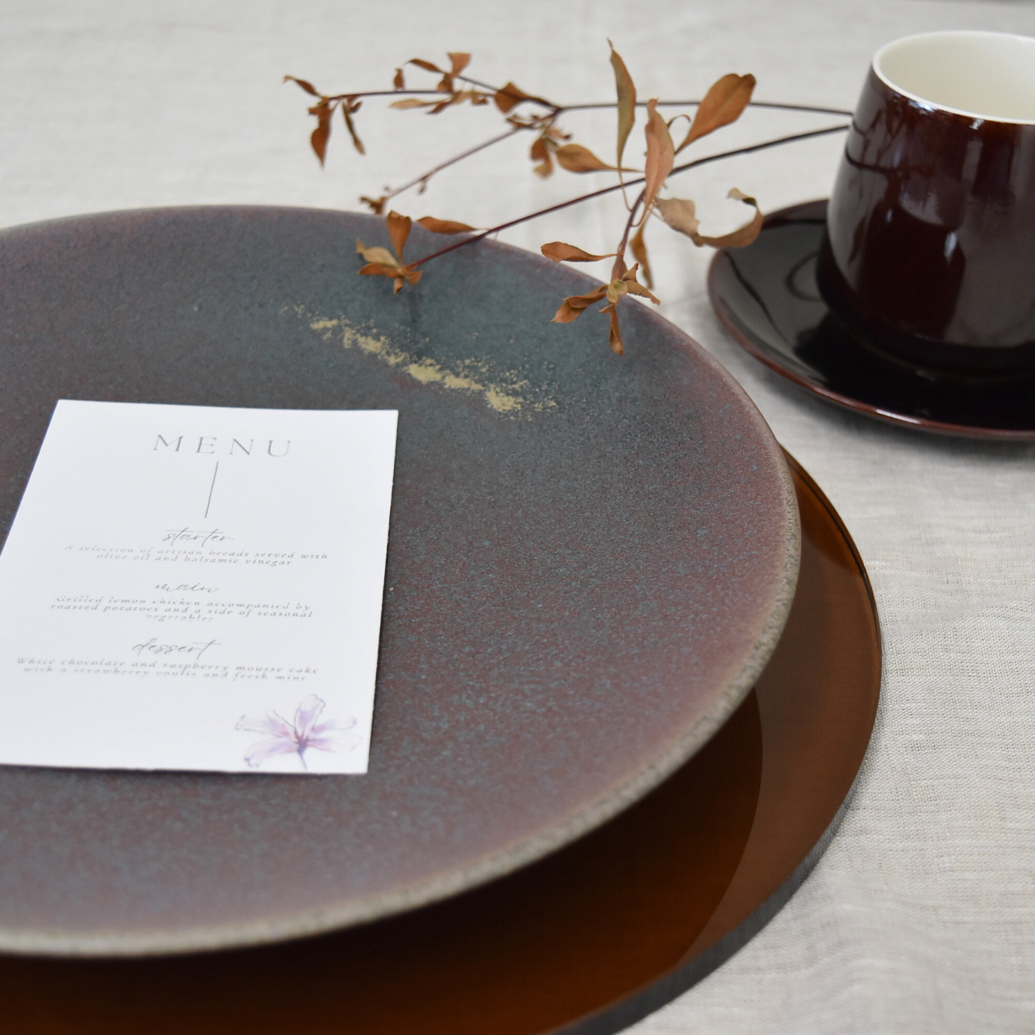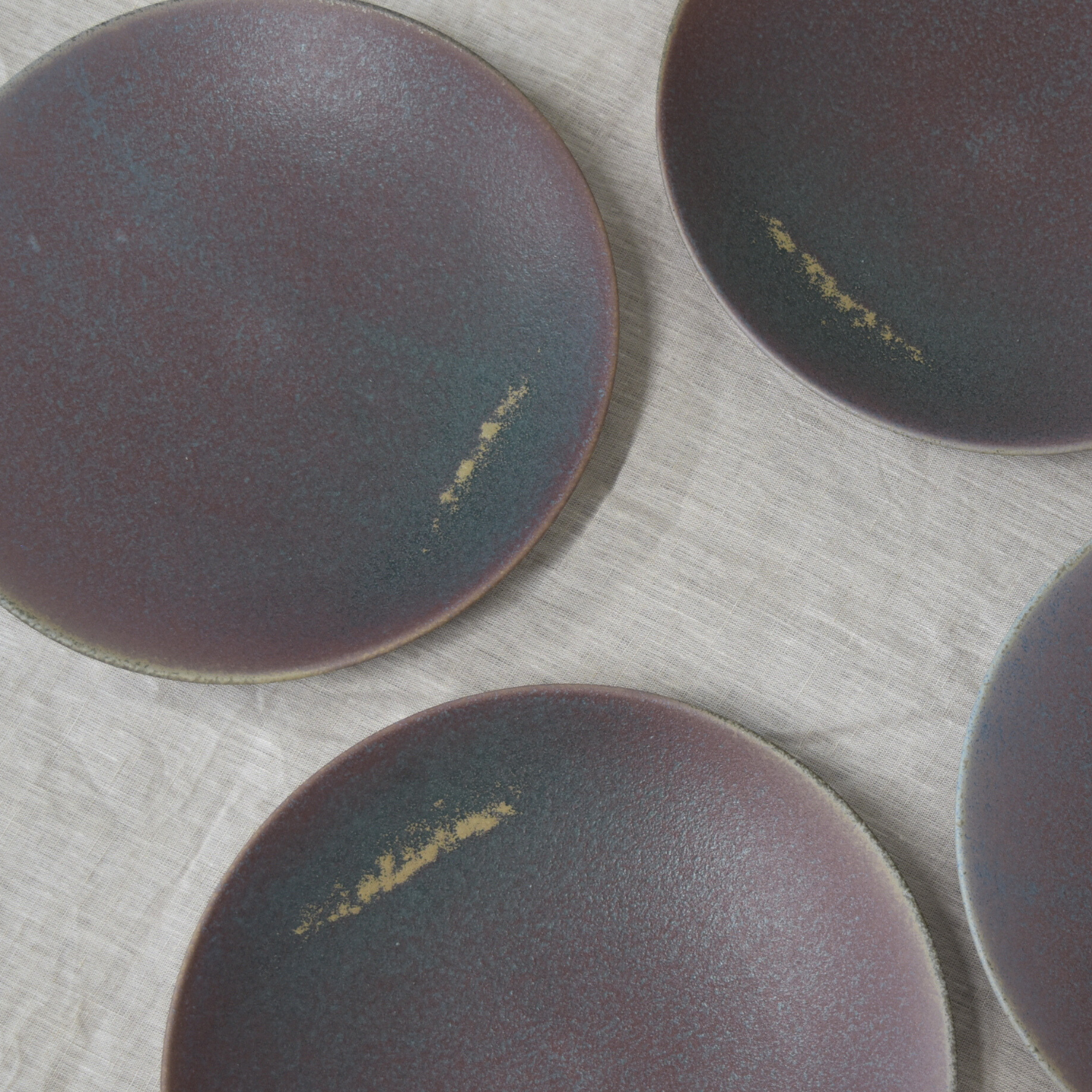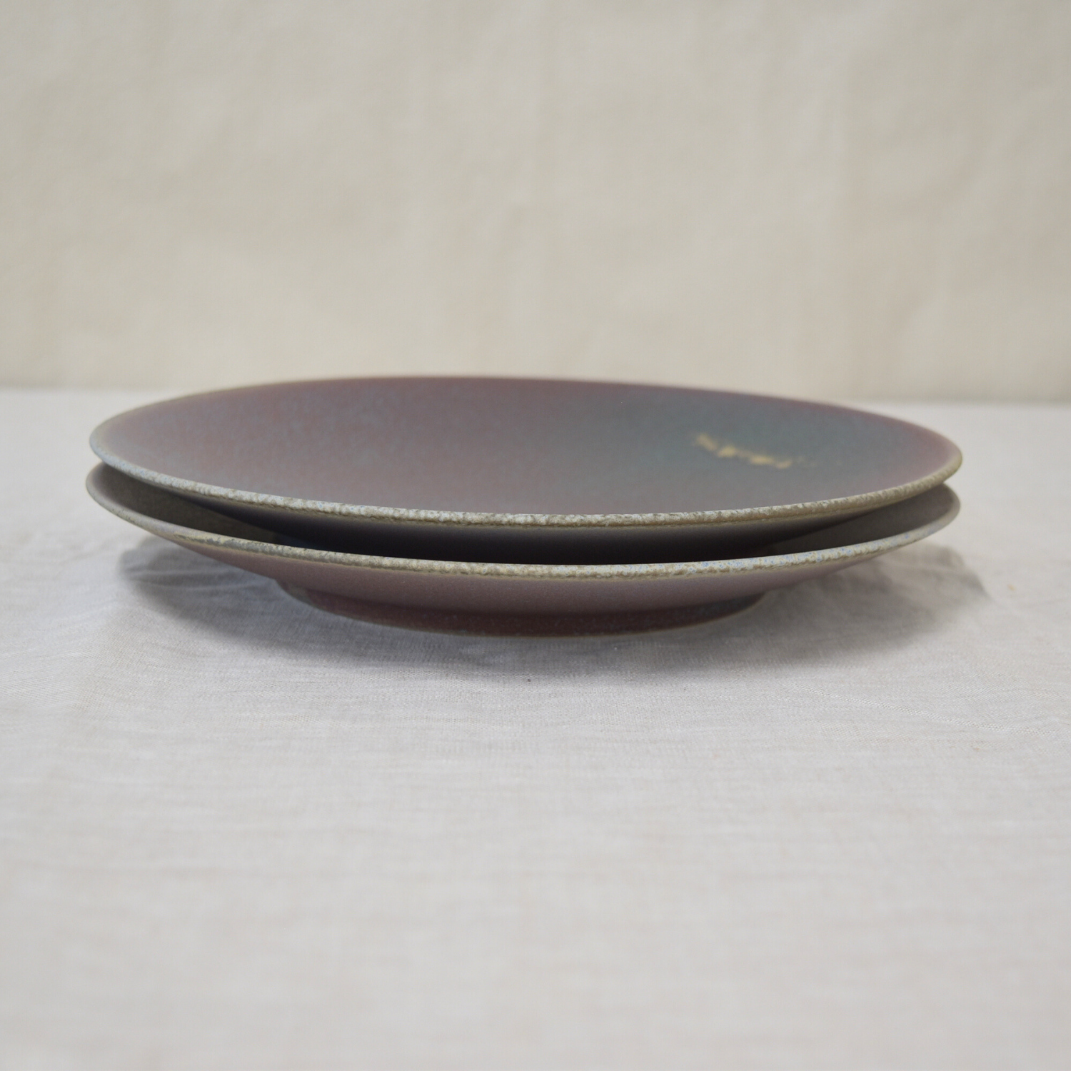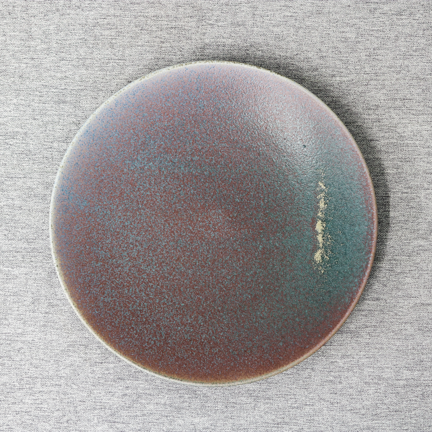 深みのある釉薬の色がにじみ合う独特の表情。このうつわはひとつひとつ異なる景色を楽しめるのが魅力です。赤みを帯びたブラウンを土台に青や緑が加わり、赤とも紫ともブルーとも定義できない発色です。