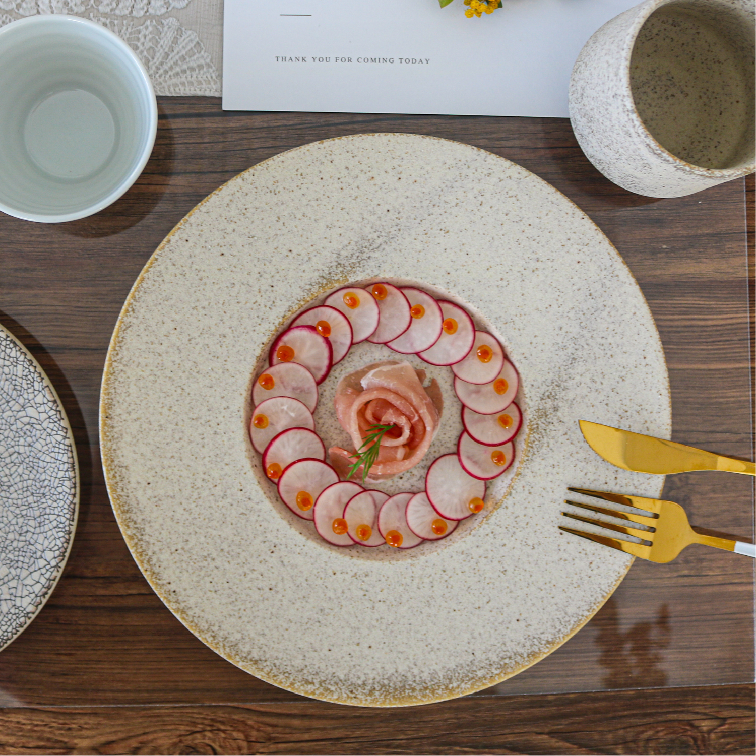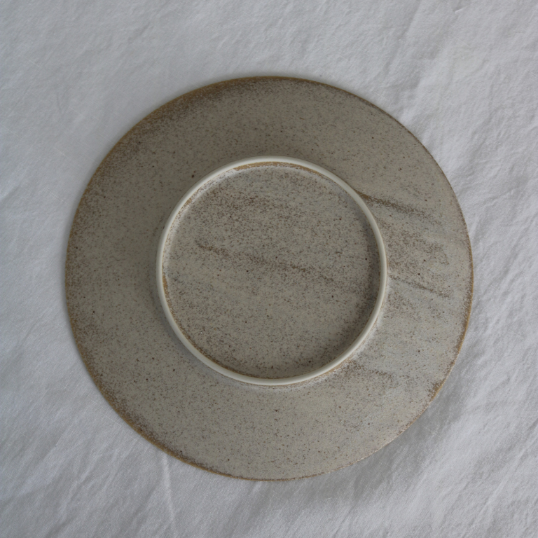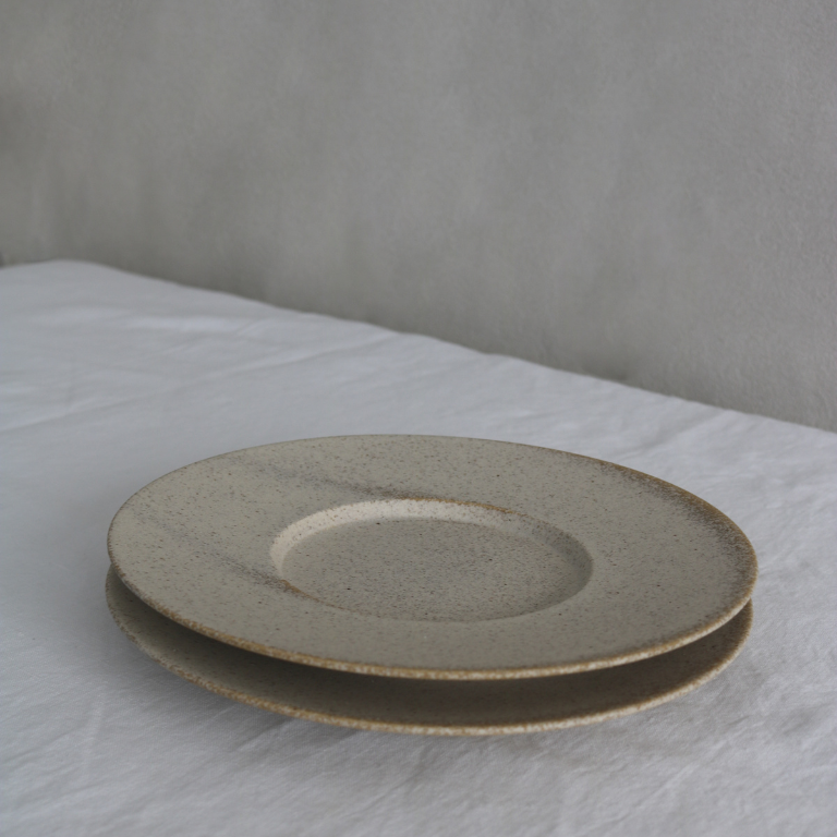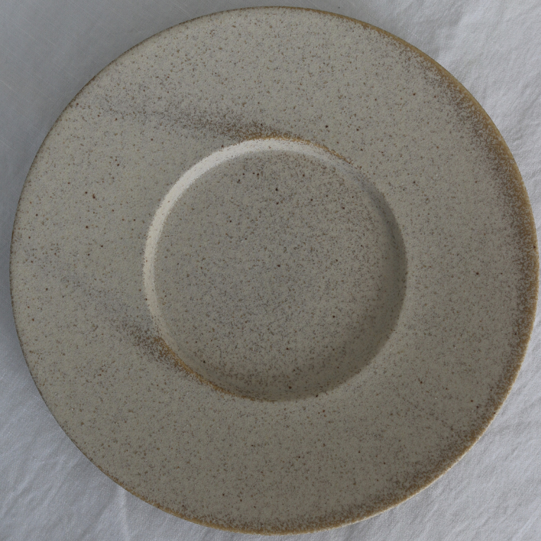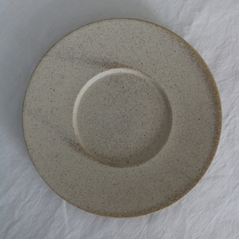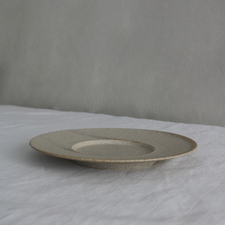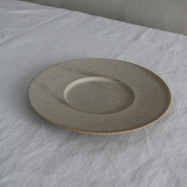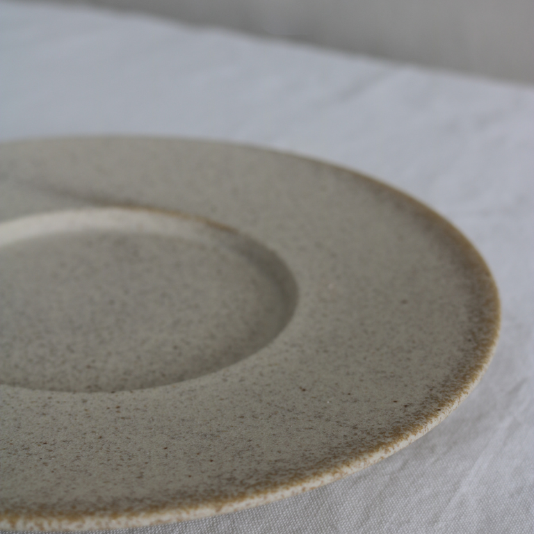 リム皿と言えばお皿に一段上がった縁をつけた皿を指しますが、この食器は平なプレートの真ん中をへこませたという表現がふさわしい形です。ストンと一段下がっているので、スープやソースのあるお料理を盛りつけるとそのフォルムがより一層引き立ちます。サンドベージュの色合いとスマートなフォルムはなんとも芸術的。