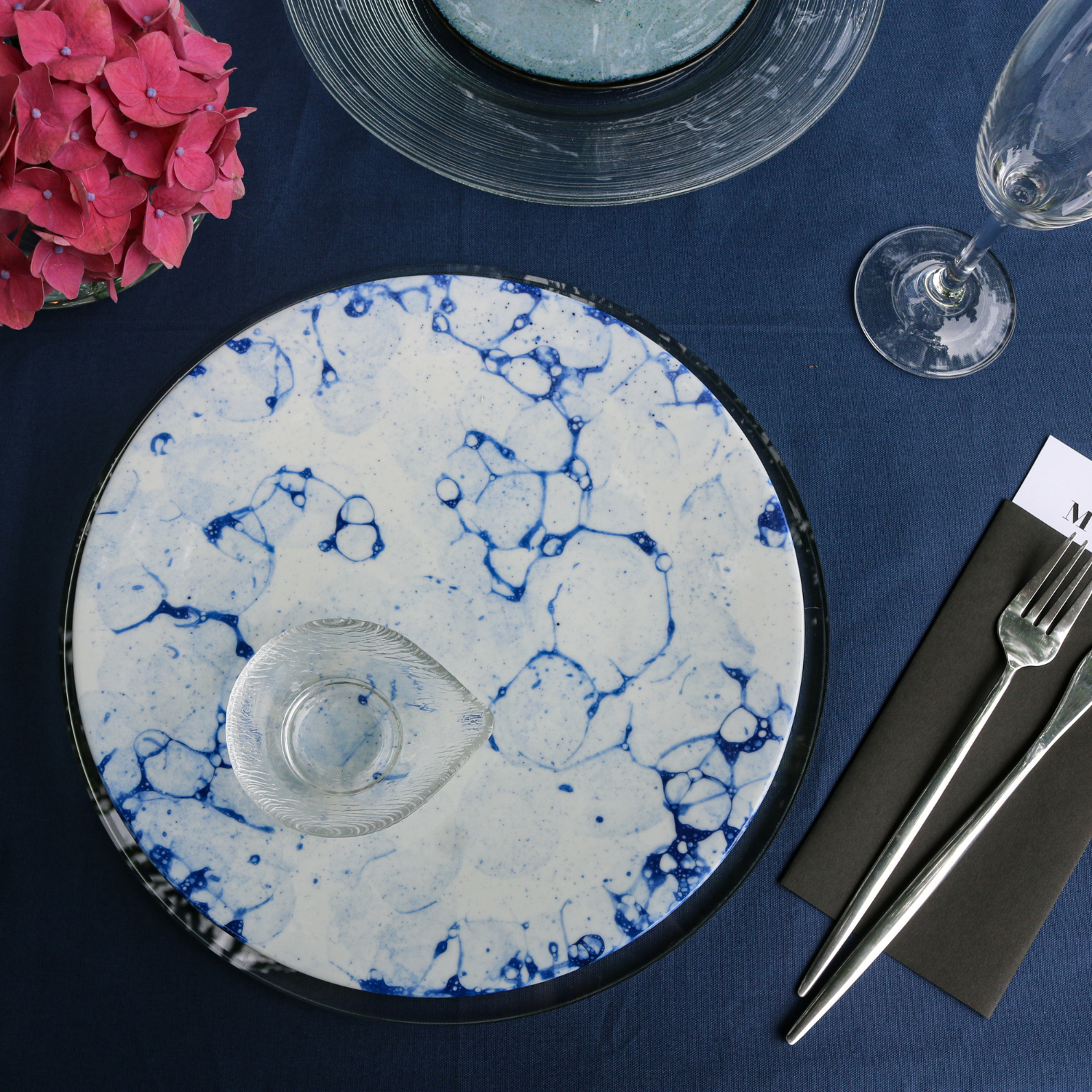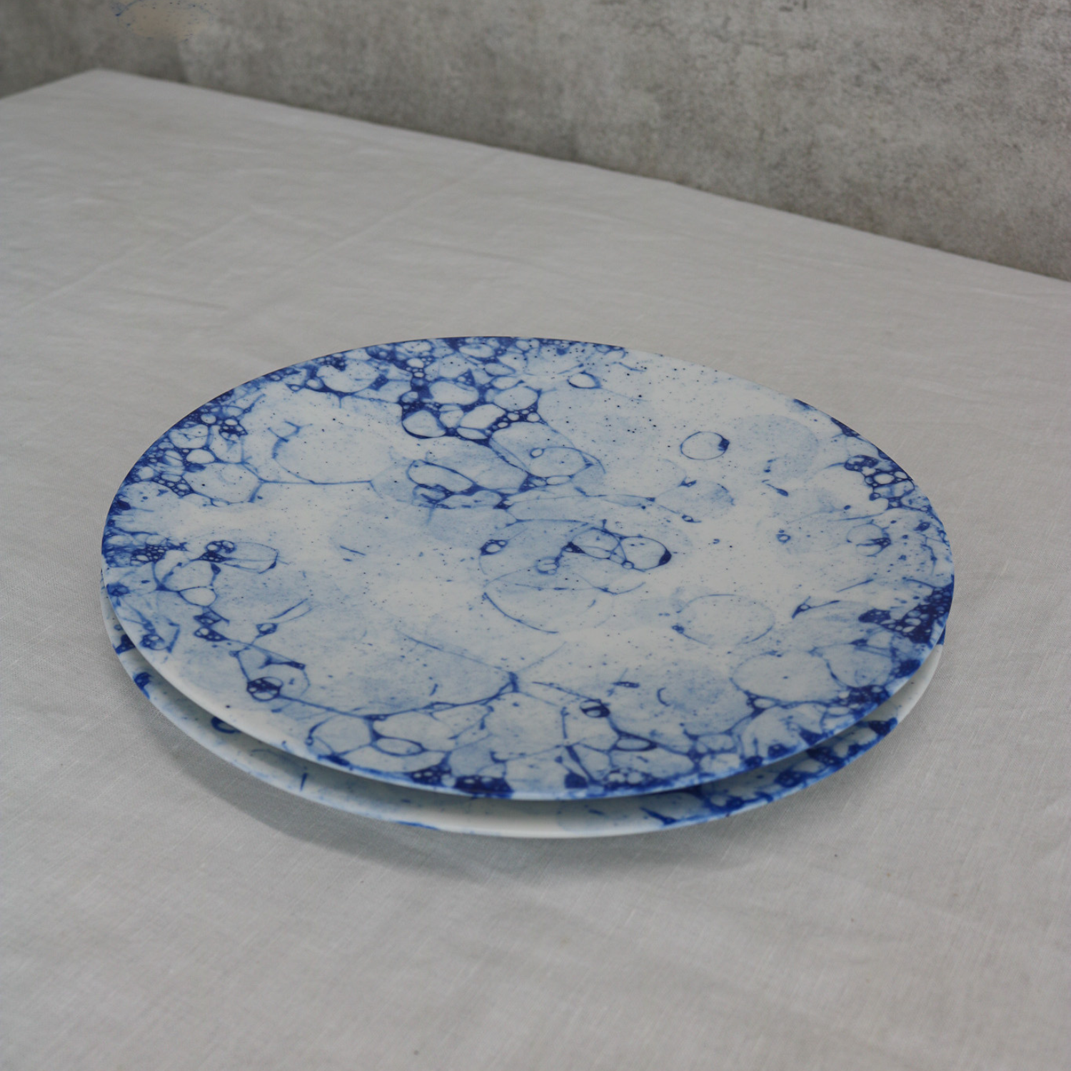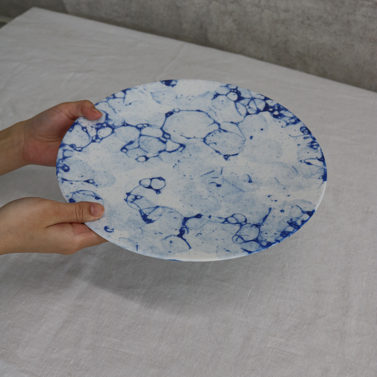 水面にいく重にも輪を描いて広がる波の模様と白と青のコントラストが美しいプレートです。お刺身を盛りつけたり、洋風ならカルパッチョと、生ものを美味しく魅せてくれるそんなプレートです。白いプレートを重ねても爽やかさが際立ちます。