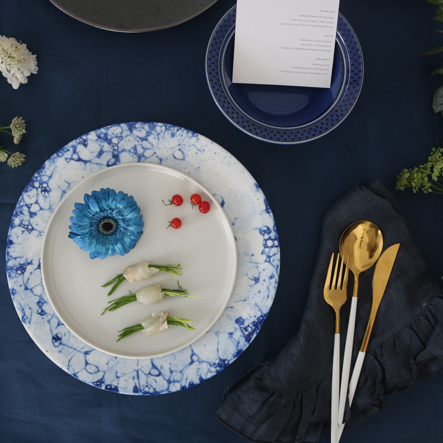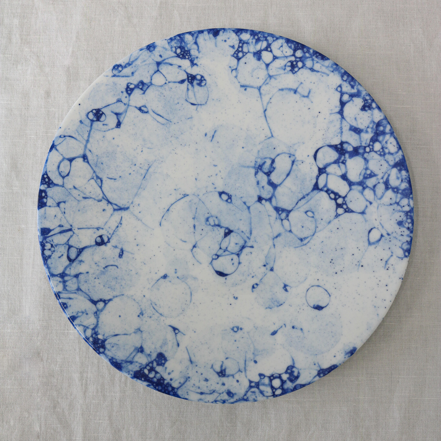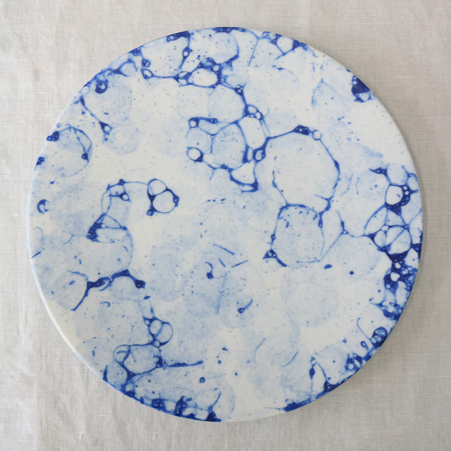 水面にいく重にも輪を描いて広がる波の模様と白と青のコントラストが美しいプレートです。お刺身を盛りつけたり、洋風ならカルパッチョと、生ものを美味しく魅せてくれるそんなプレートです。白いプレートを重ねても爽やかさが際立ちます。