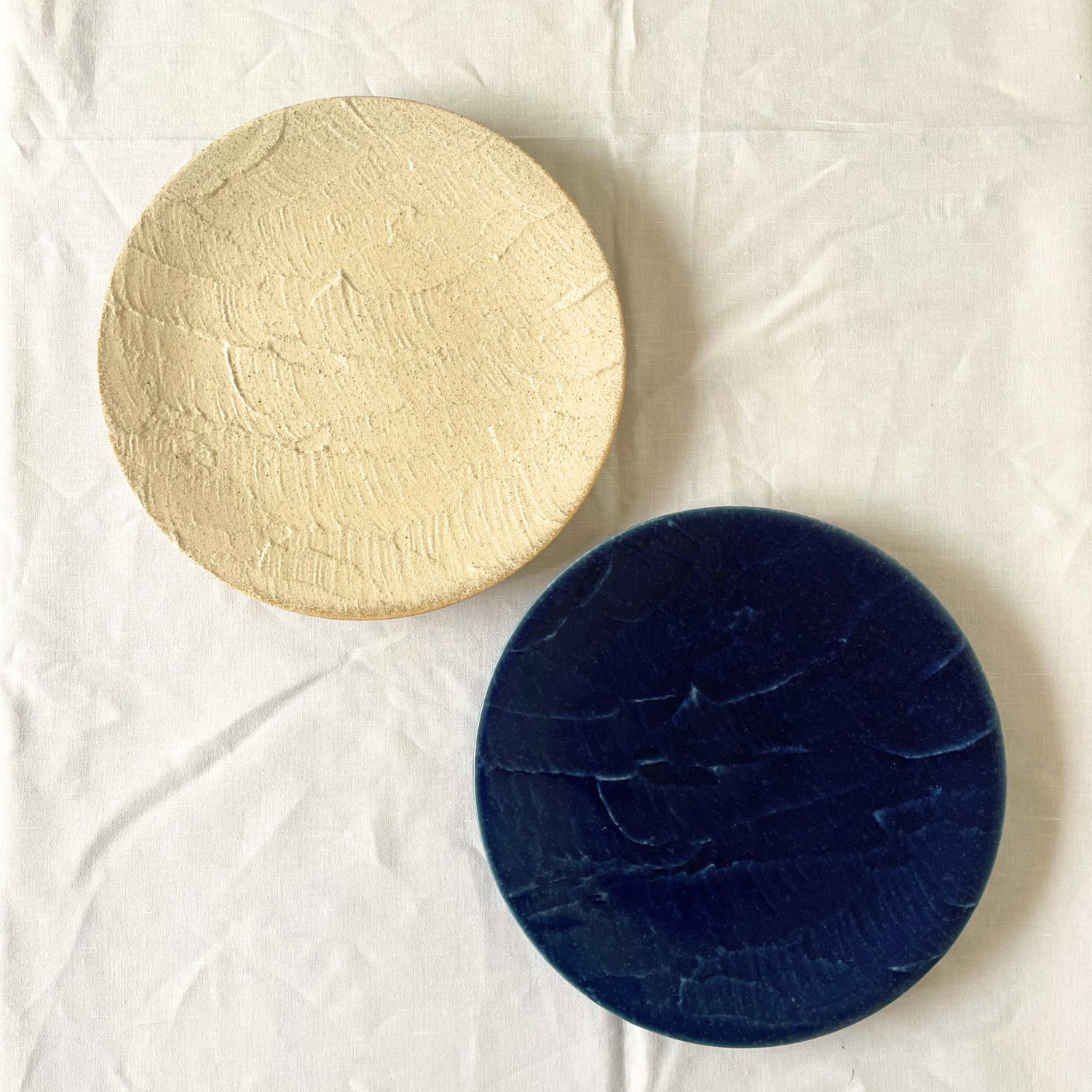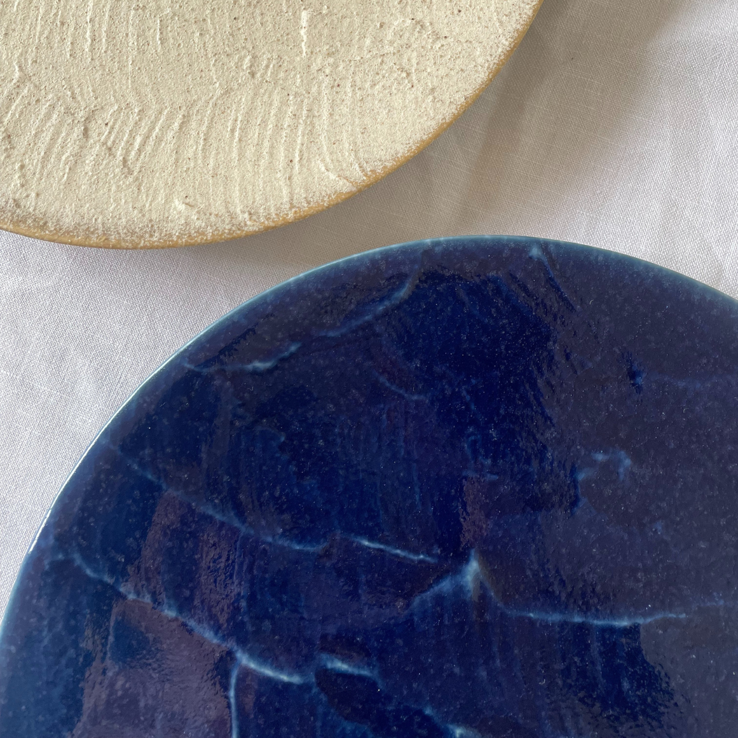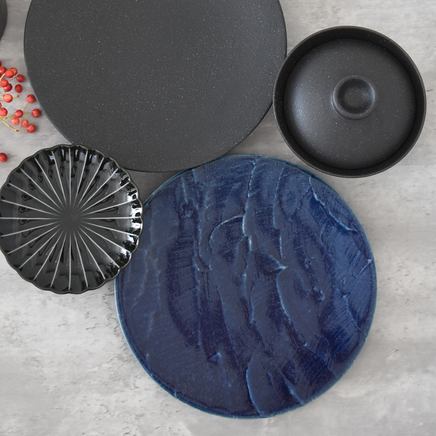 青の「一縷」は、深く静かな藍色のツヤ感のあるプレート。和のテイストにも関わらず、デニム地のようにも見えるモダンで不思議な印象の器です。消えそうな細い糸を意味する「いちる」という名を持つこのうつわは、釉薬のゆらぎが光をうけて、夜空のような儚さと奥行きを見せます。