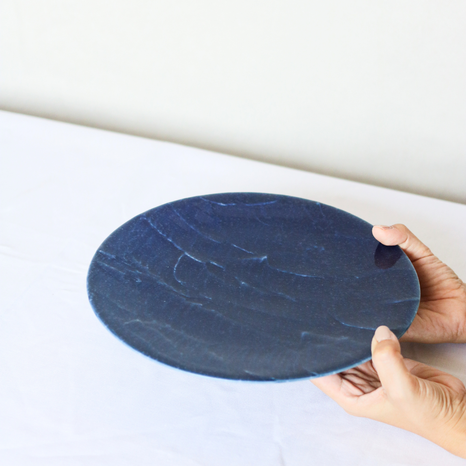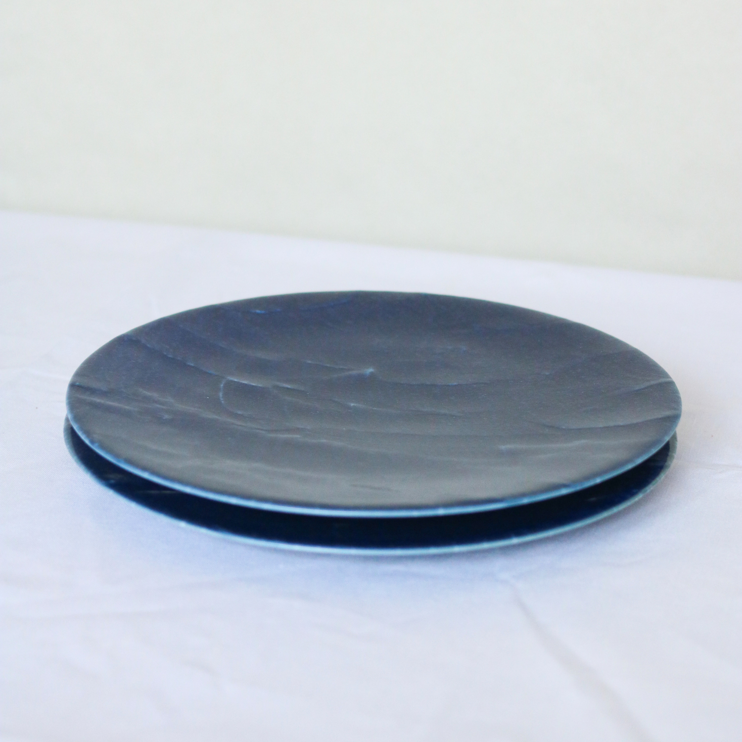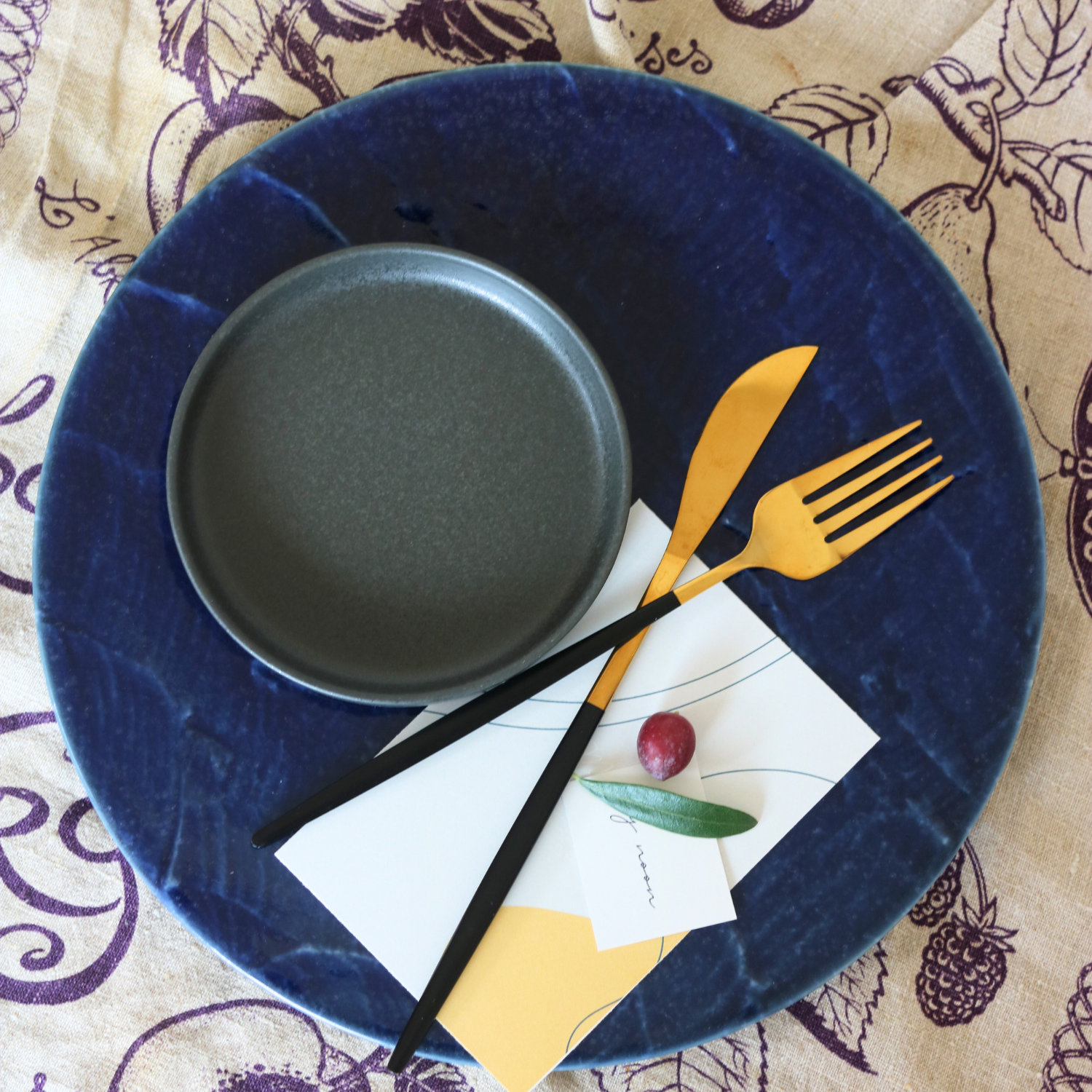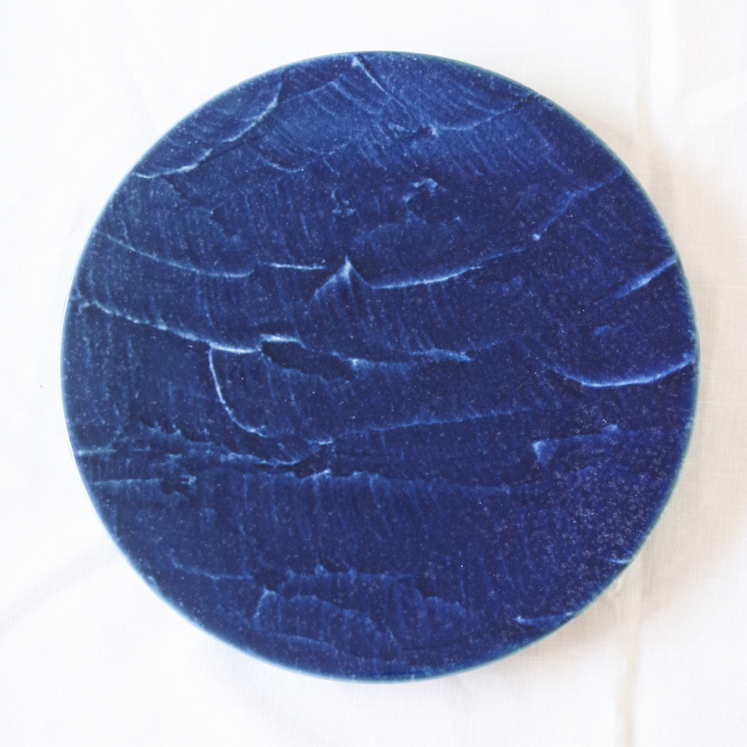 青の「一縷」は、深く静かな藍色のツヤ感のあるプレート。和のテイストにも関わらず、デニム地のようにも見えるモダンで不思議な印象の器です。消えそうな細い糸を意味する「いちる」という名を持つこのうつわは、釉薬のゆらぎが光をうけて、夜空のような儚さと奥行きを見せます。