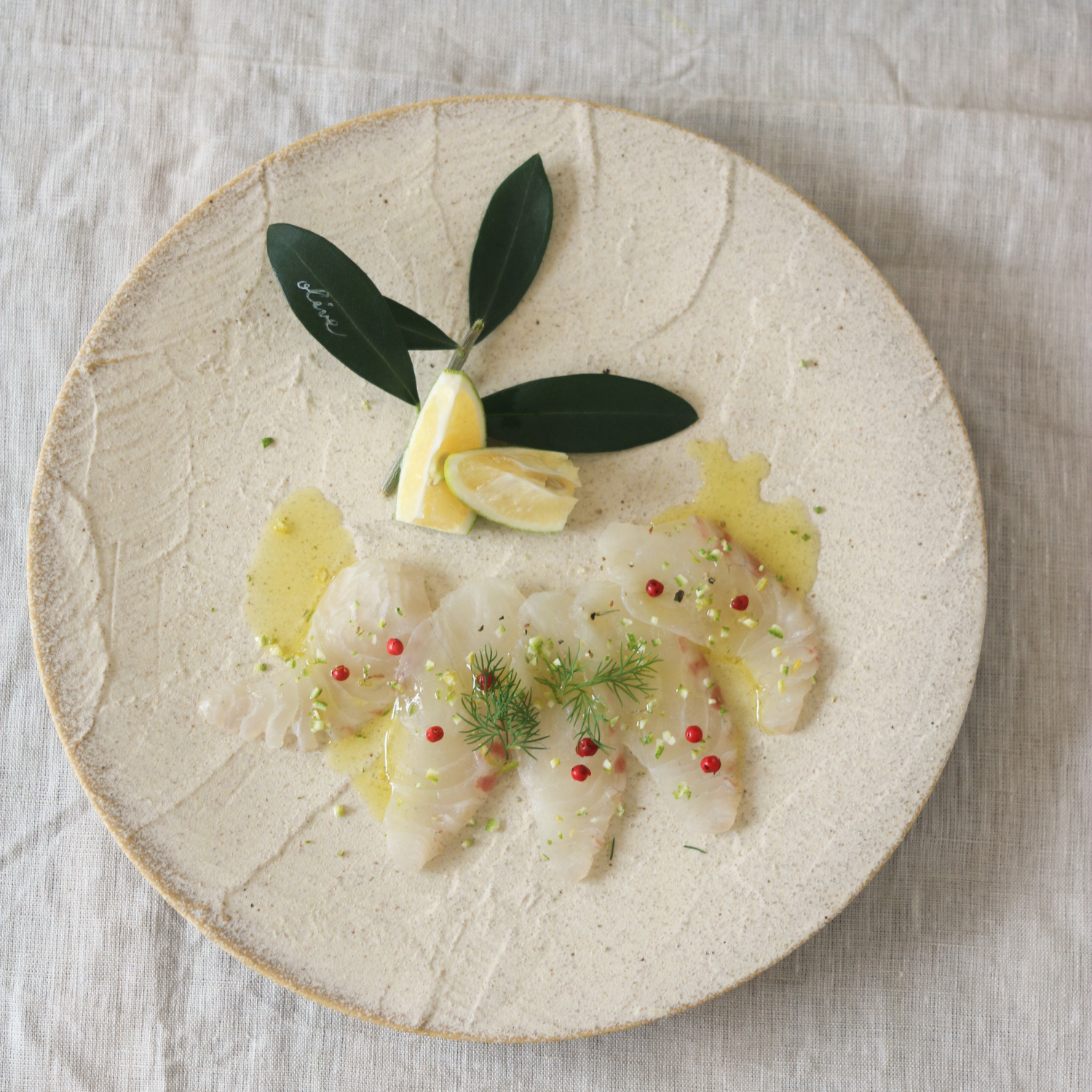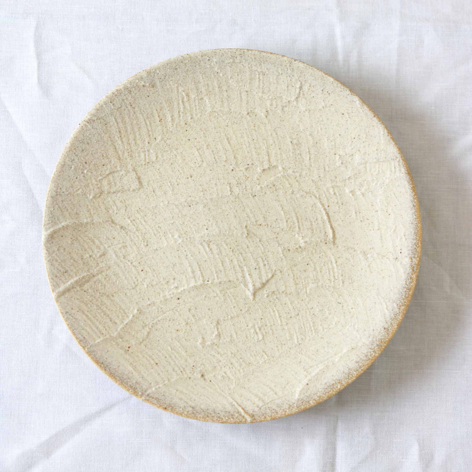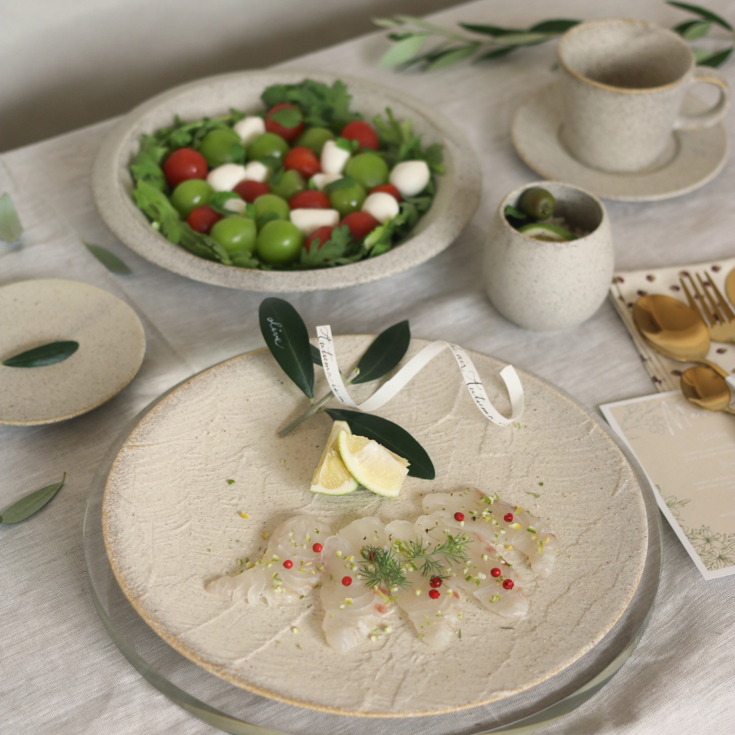 白の「絹衣」は、生成りのような色合い。やさしいマットの質感が料理を包み込み、和にも洋にもなじみます。ザラっとした質感で、傷もつきにくく普段使いにもおすすめです。