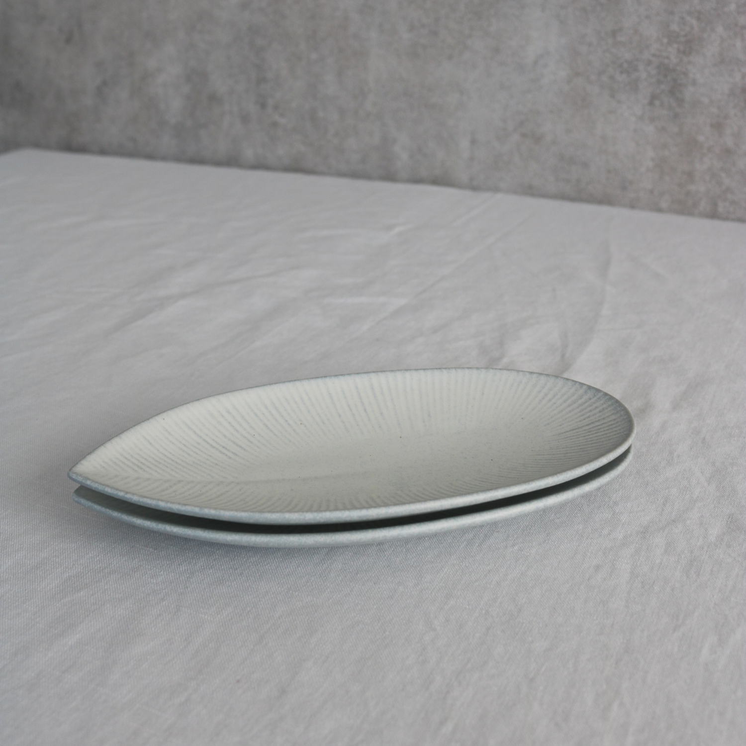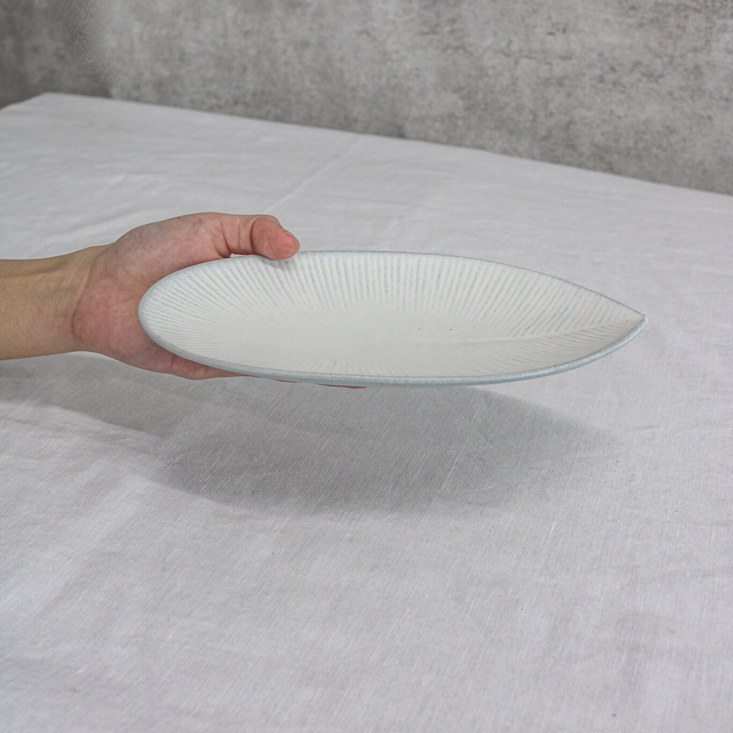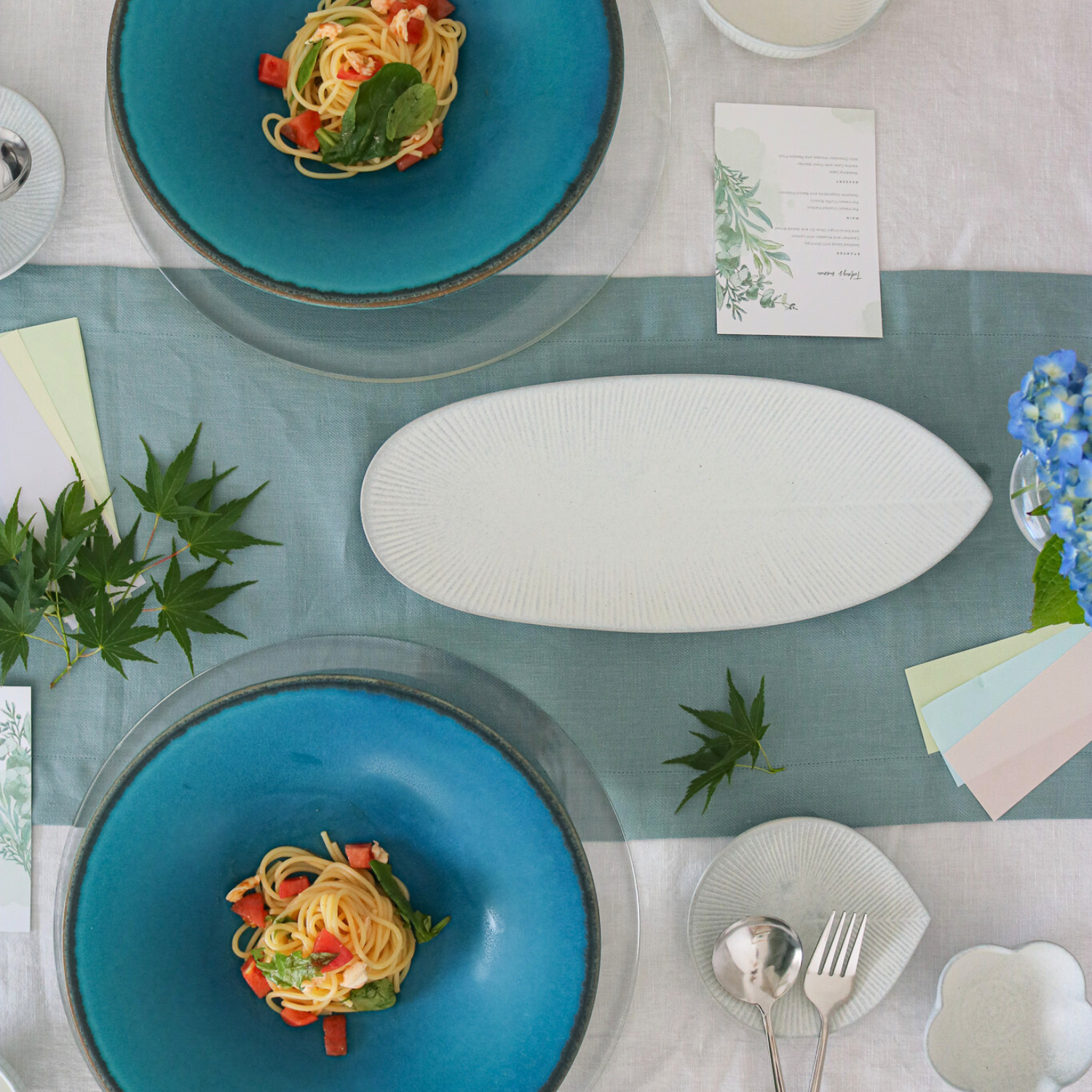 ベーシックなお皿と言えば、丸いものを思い浮かべる方が多いと思いますが、長皿は一つあるととても便利なお皿です。丸いお皿が並ぶテーブルにメリハリが出て、普段の食卓に変化がつきますし、無造作に盛りつけても、丸皿よりもさまになります。デザイン性に富んだおしゃれな形ですが、シンプルな白の器はどんな食器とも合わせやすく、縁の細かいストライプもお料理を引き立ててくれるような、さりげないデザインです。