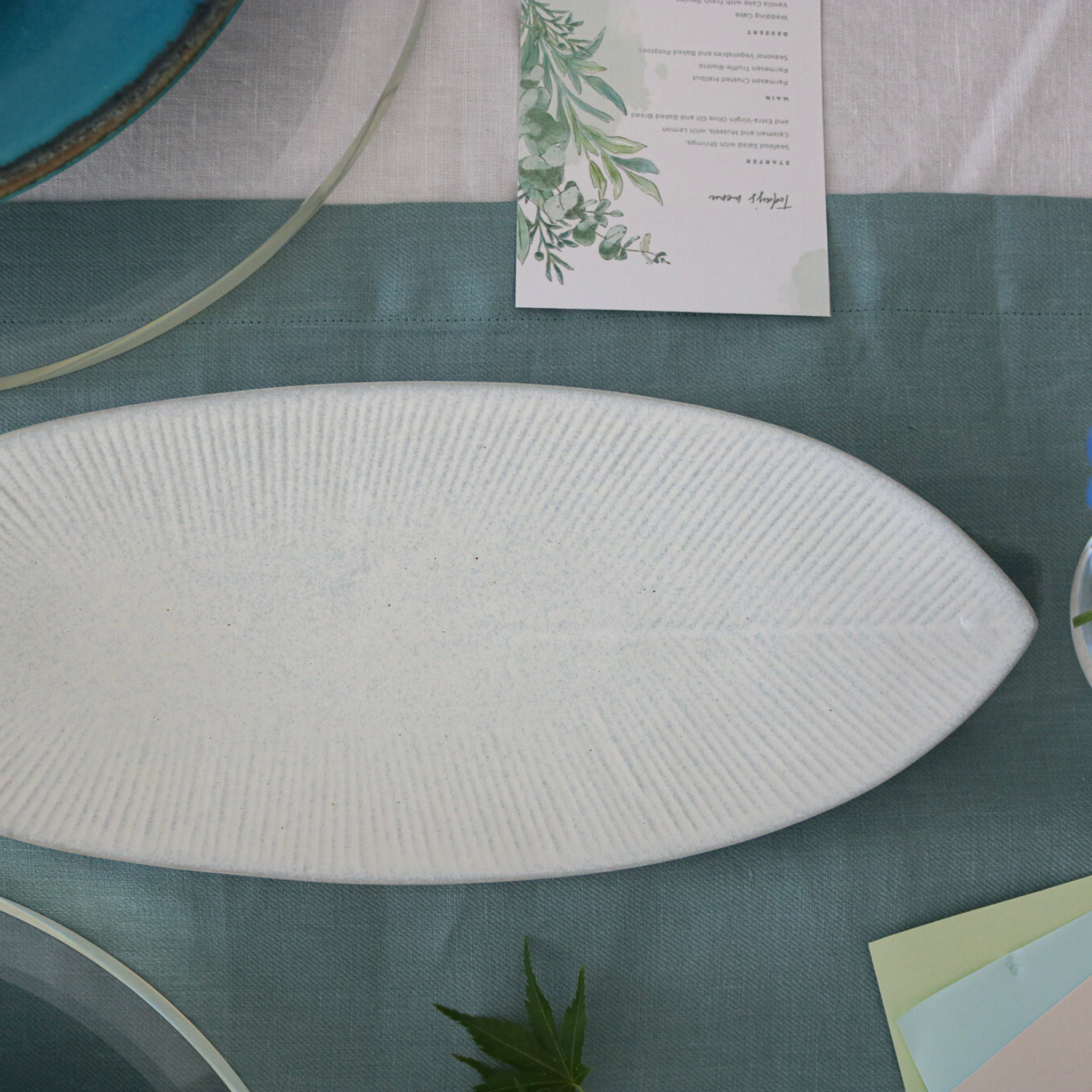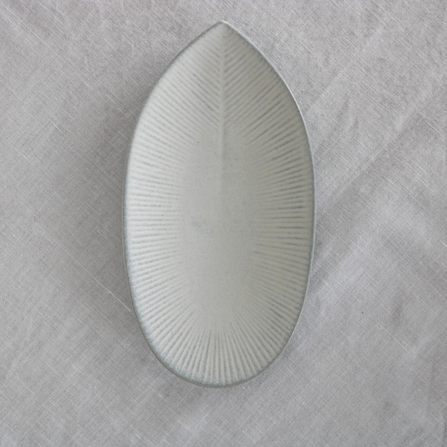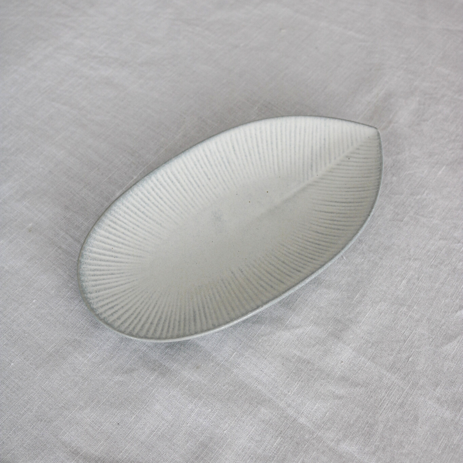 ベーシックなお皿と言えば、丸いものを思い浮かべる方が多いと思いますが、長皿は一つあるととても便利なお皿です。丸いお皿が並ぶテーブルにメリハリが出て、普段の食卓に変化がつきますし、無造作に盛りつけても、丸皿よりもさまになります。デザイン性に富んだおしゃれな形ですが、シンプルな白の器はどんな食器とも合わせやすく、縁の細かいストライプもお料理を引き立ててくれるような、さりげないデザインです。