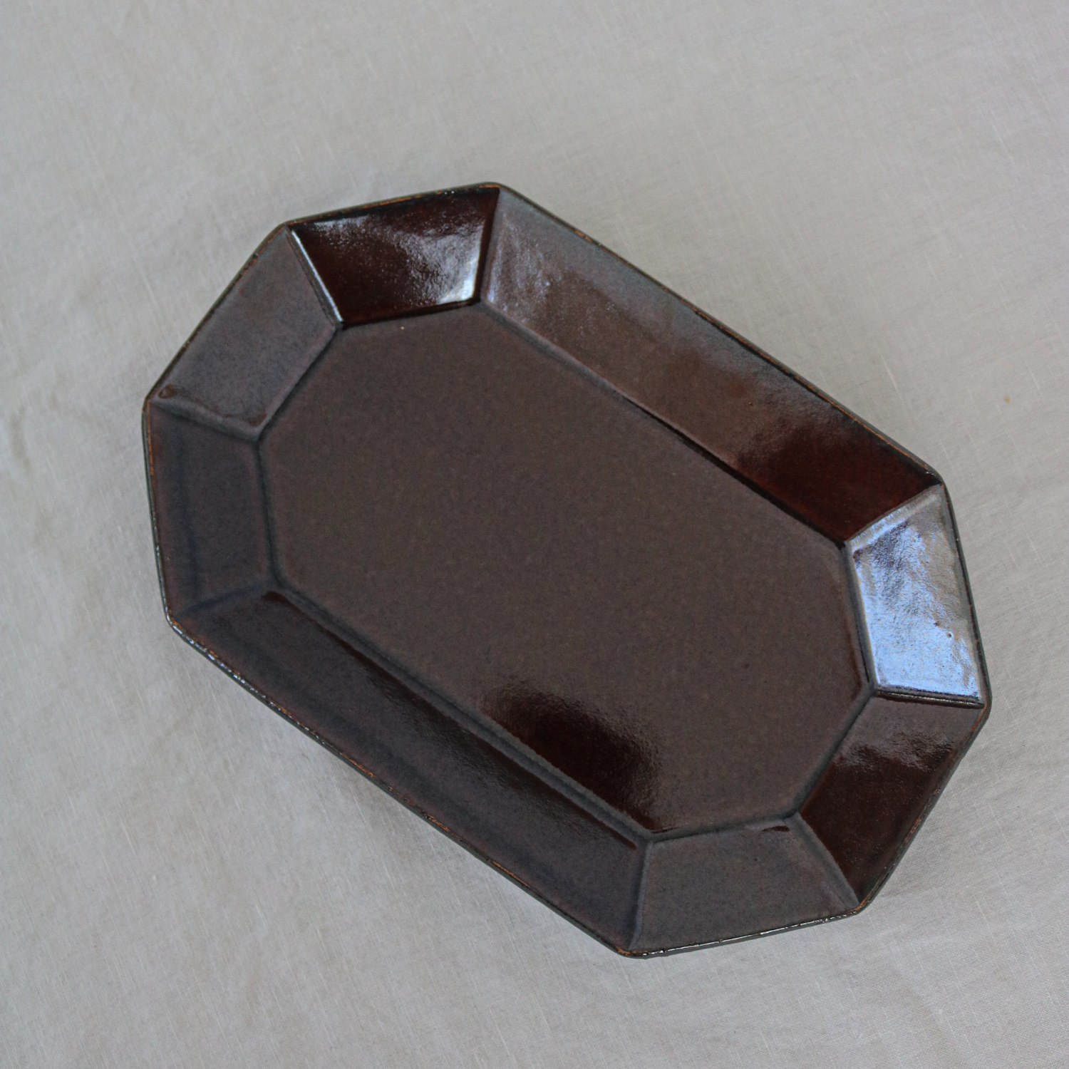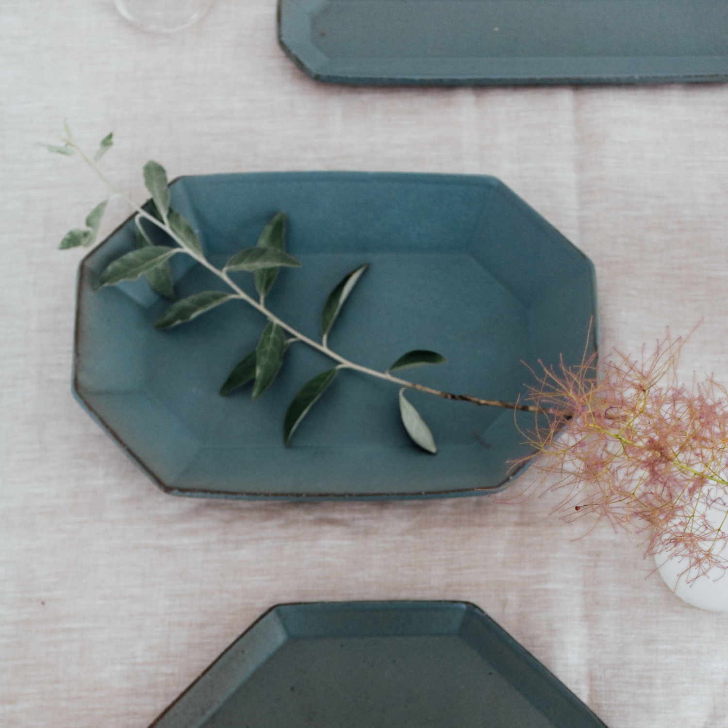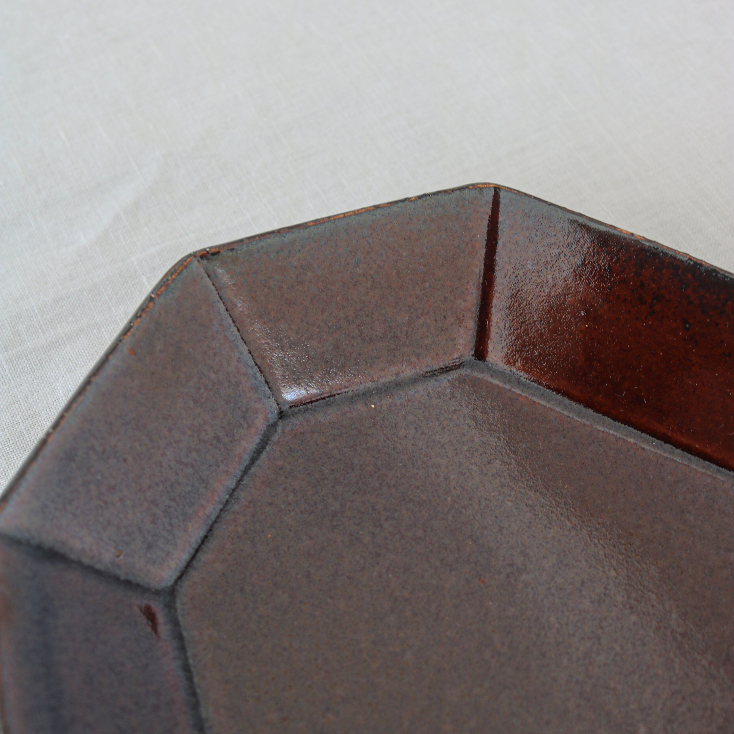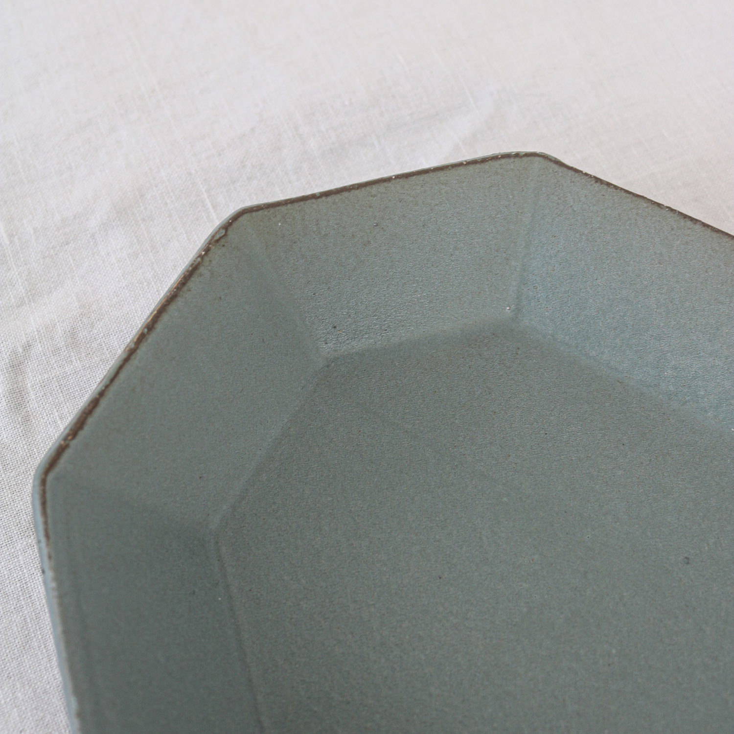 平面だけでかたちづくられた八角形のお皿。丸い器にはない独特の美しさがあります。空間を彩るタイルのノウハウが生かされています。