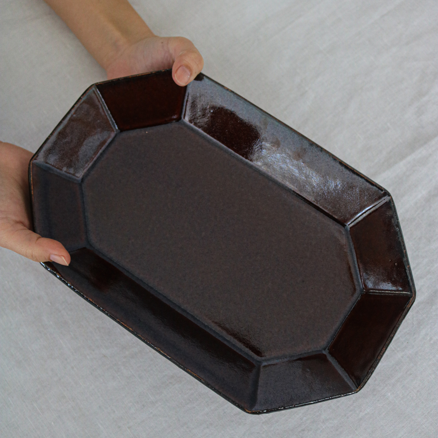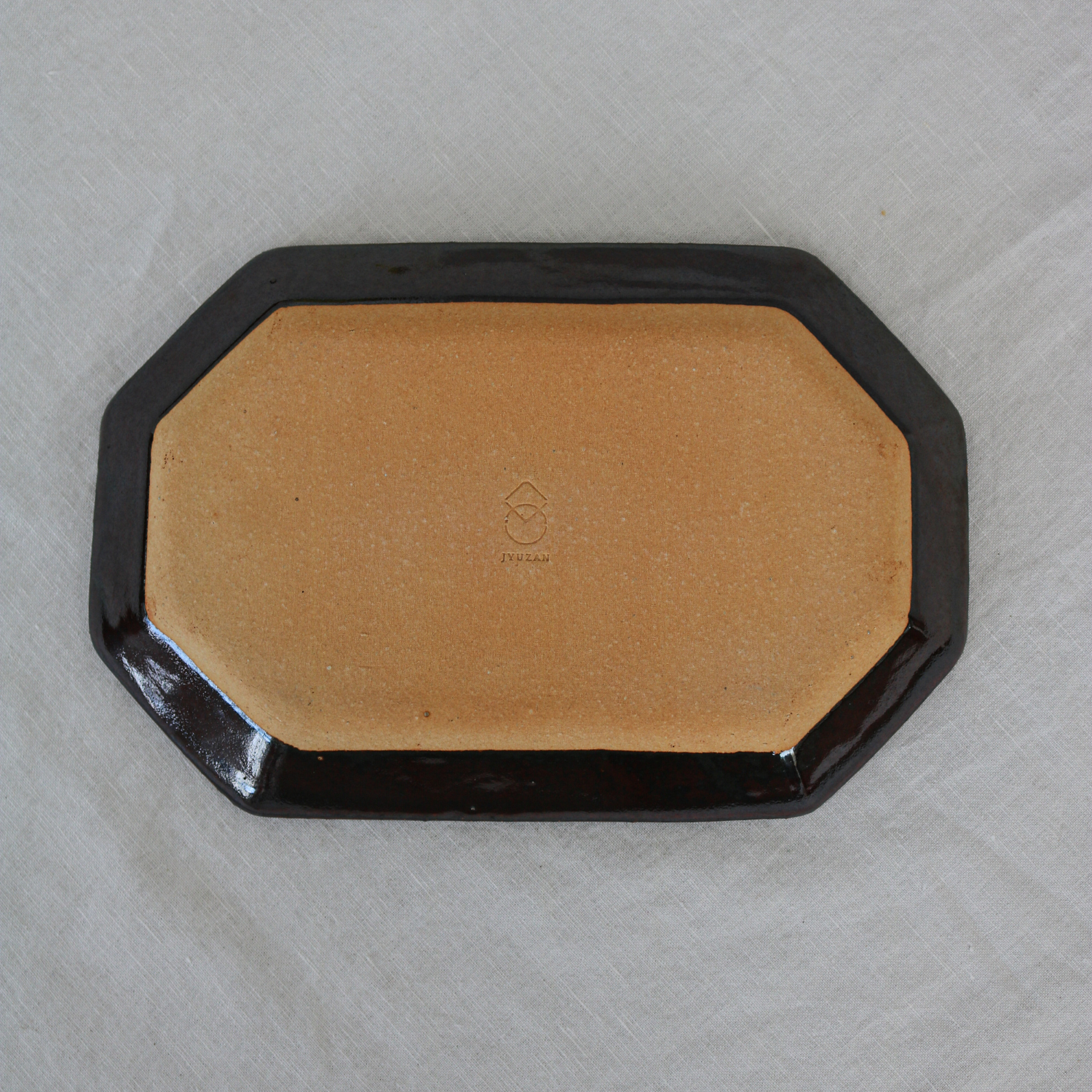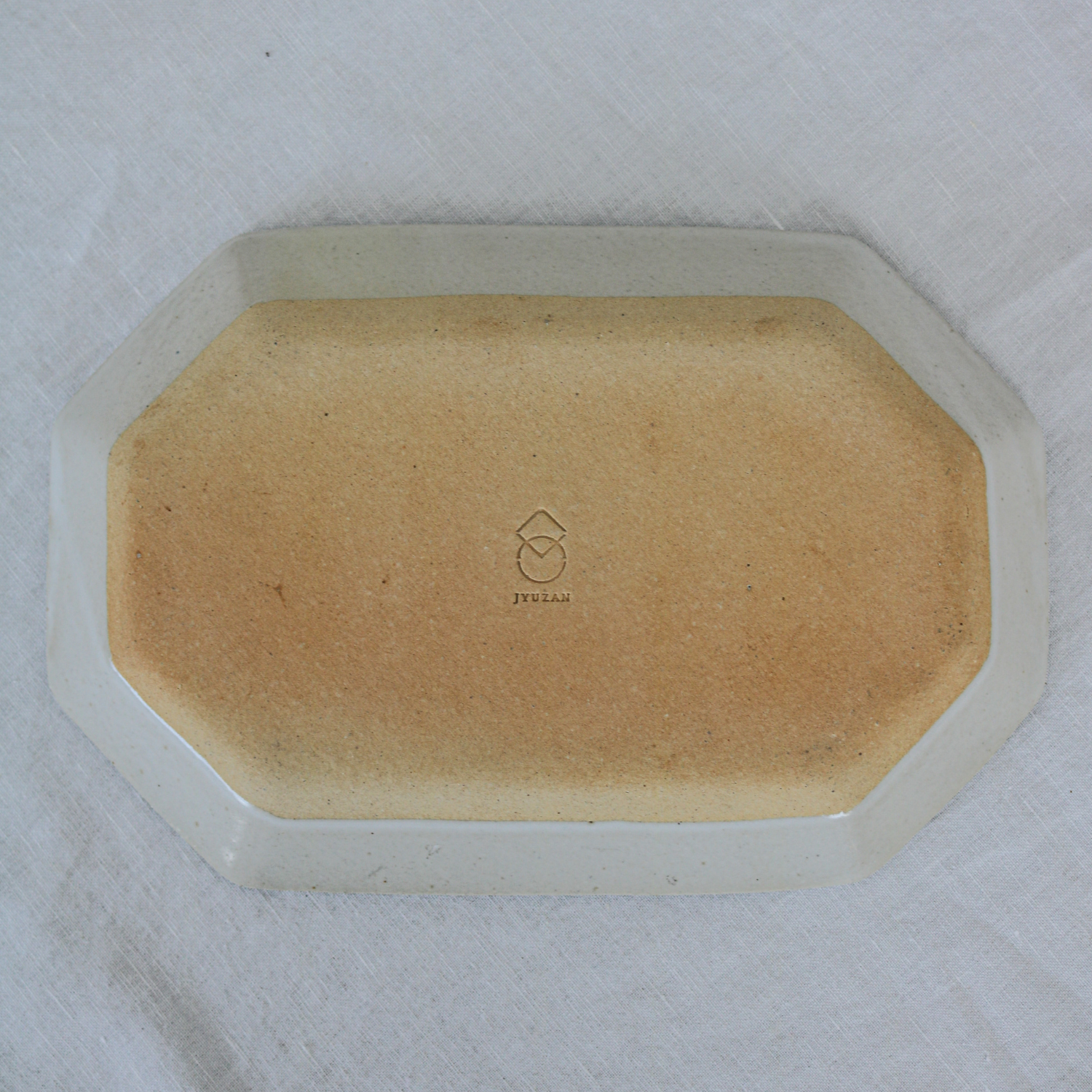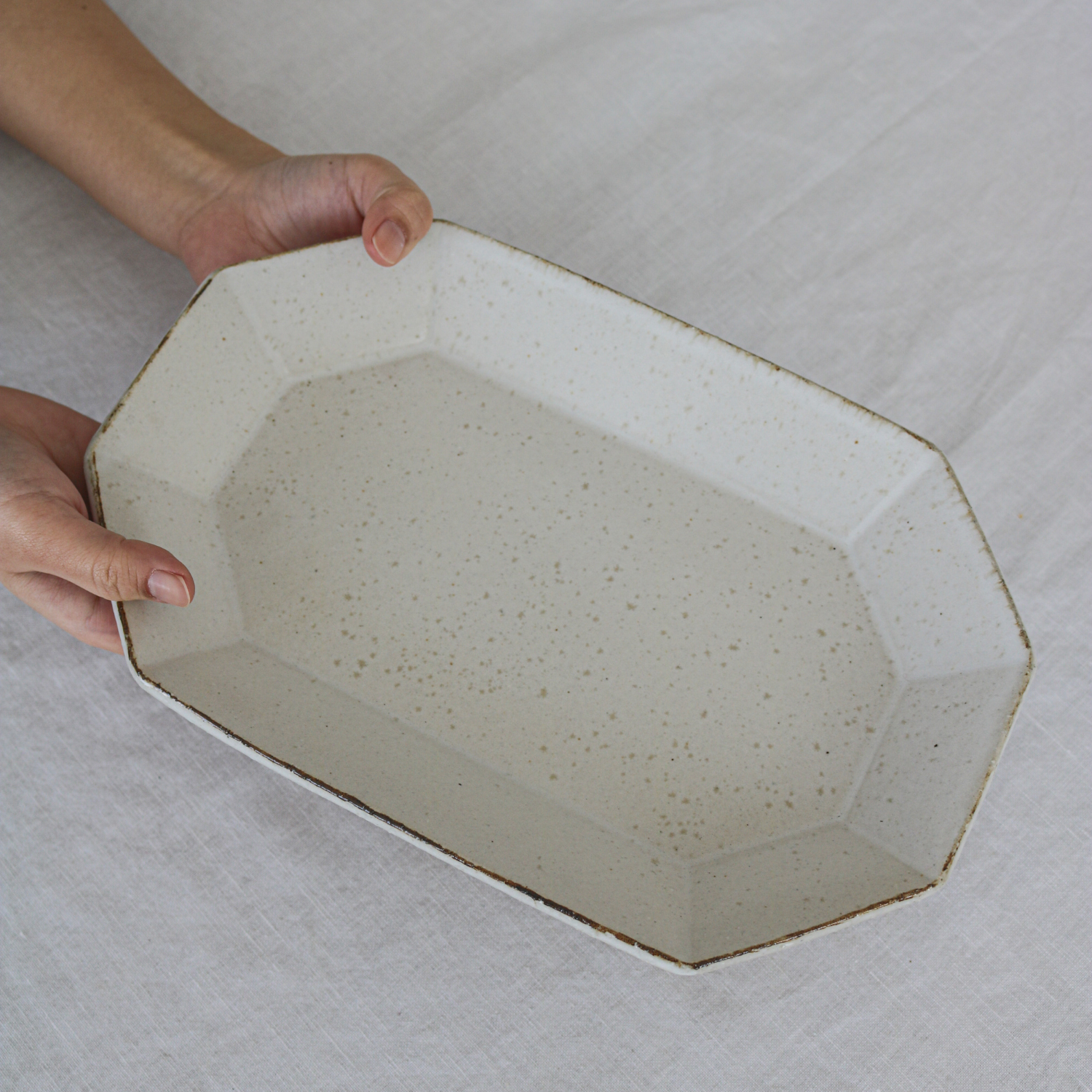 平面だけでかたちづくられた八角形のお皿。丸い器にはない独特の美しさがあります。空間を彩るタイルのノウハウが生かされています。