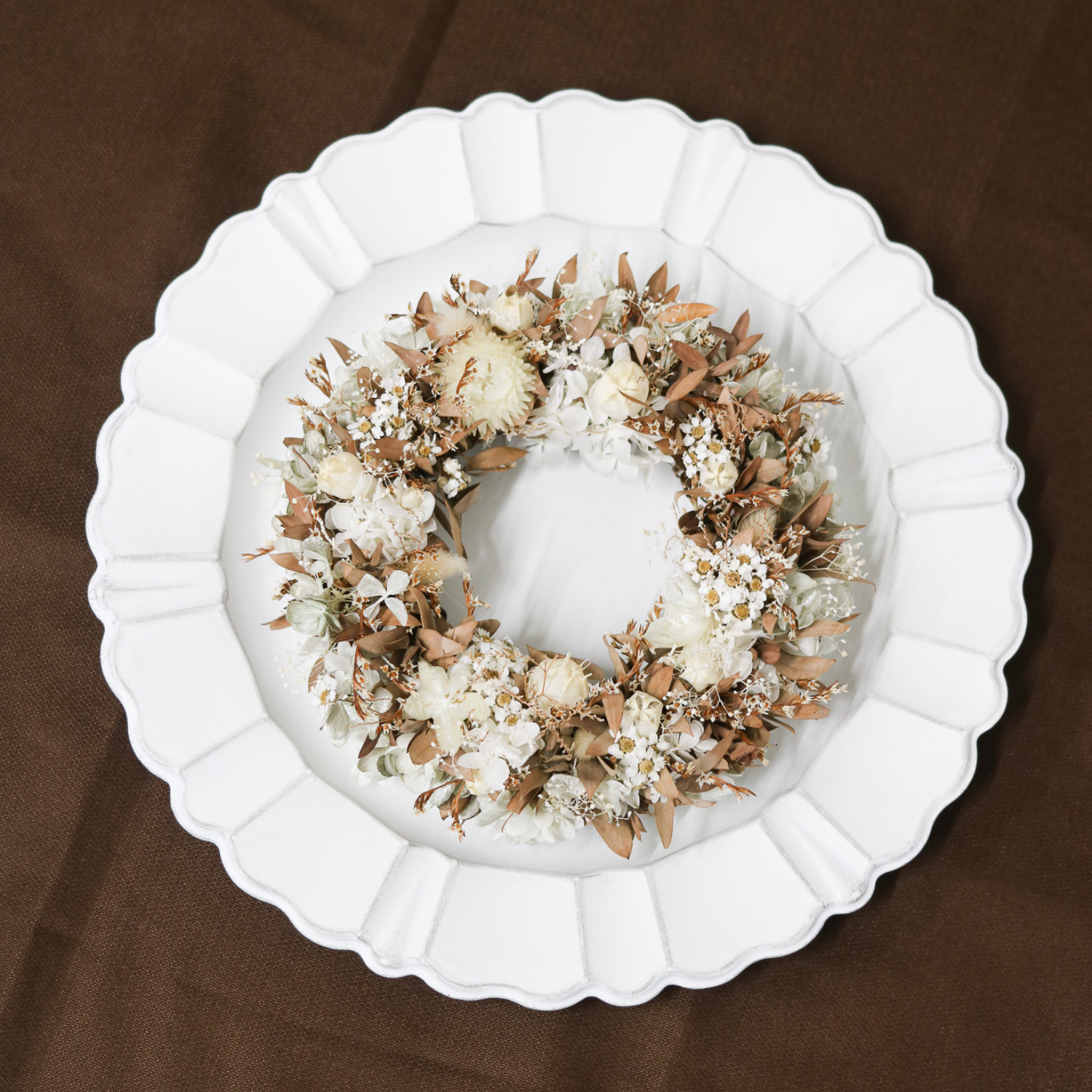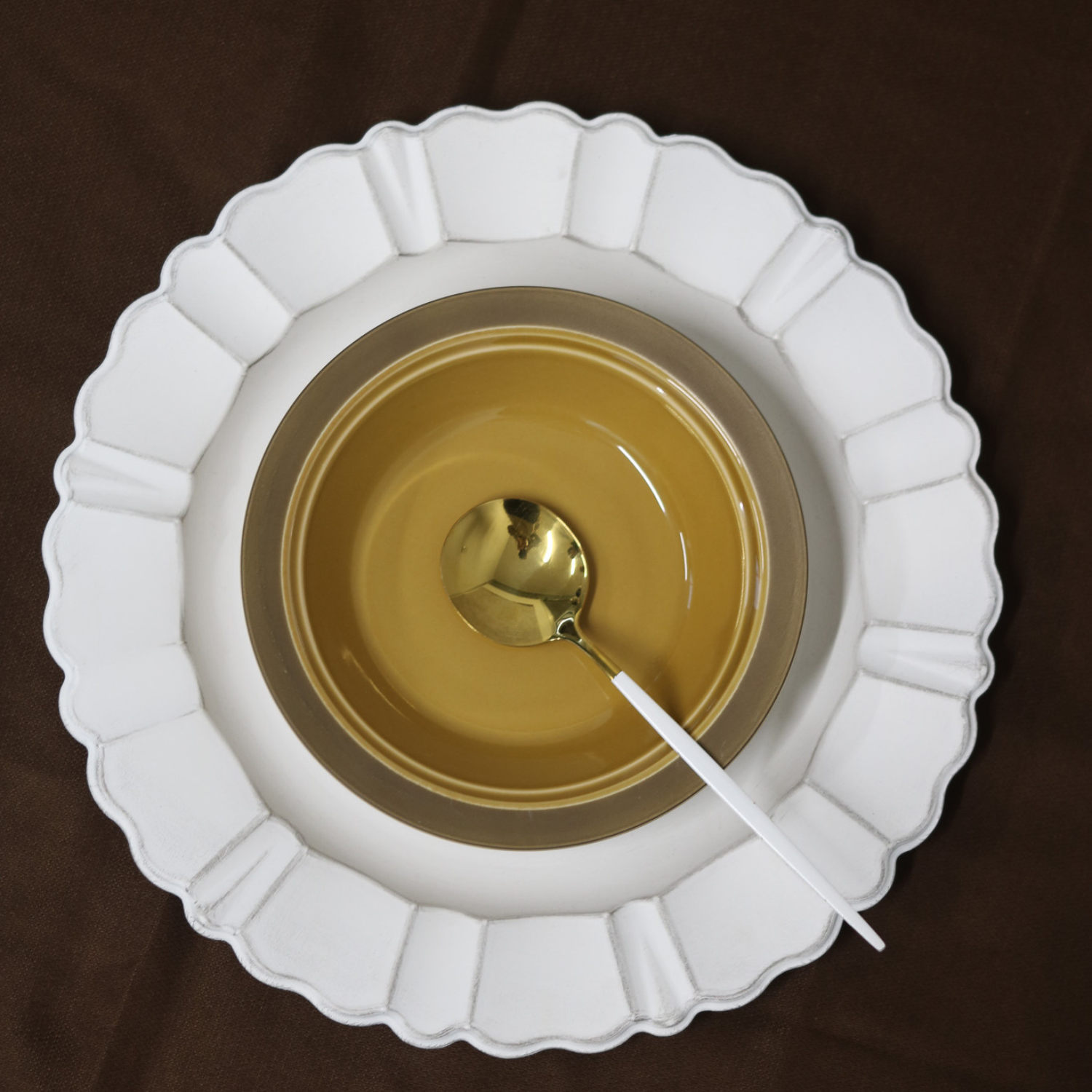 飾り皿とも言われるお皿を乗せるためのプレートです。一枚下にあるだけで、テーブルの華やかさがぐっとあがります。この上に小さいうつわをたくさん並べたり、ティーポットとカップを置いておいてもステキです。テーブルにリースを飾るためのアンダートレイにしても。アイディア次第で使い方が広がるトレーです。