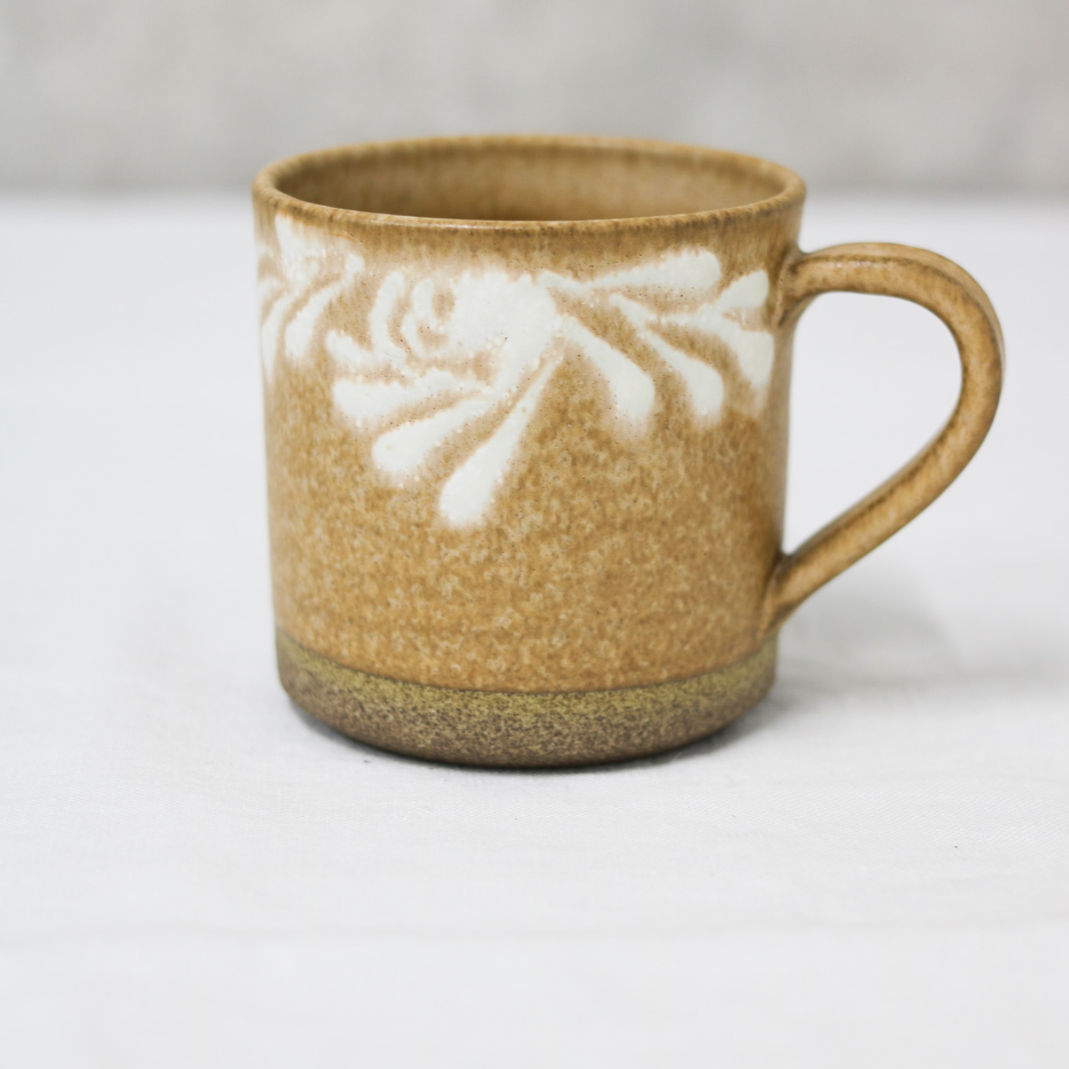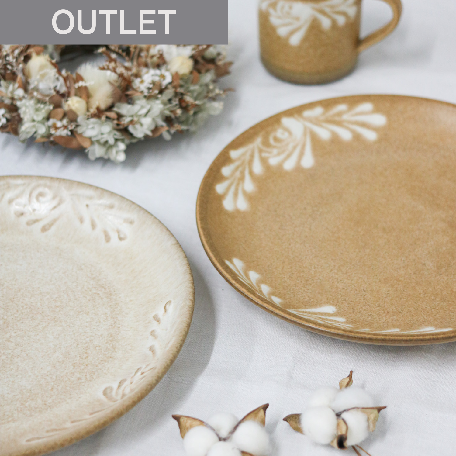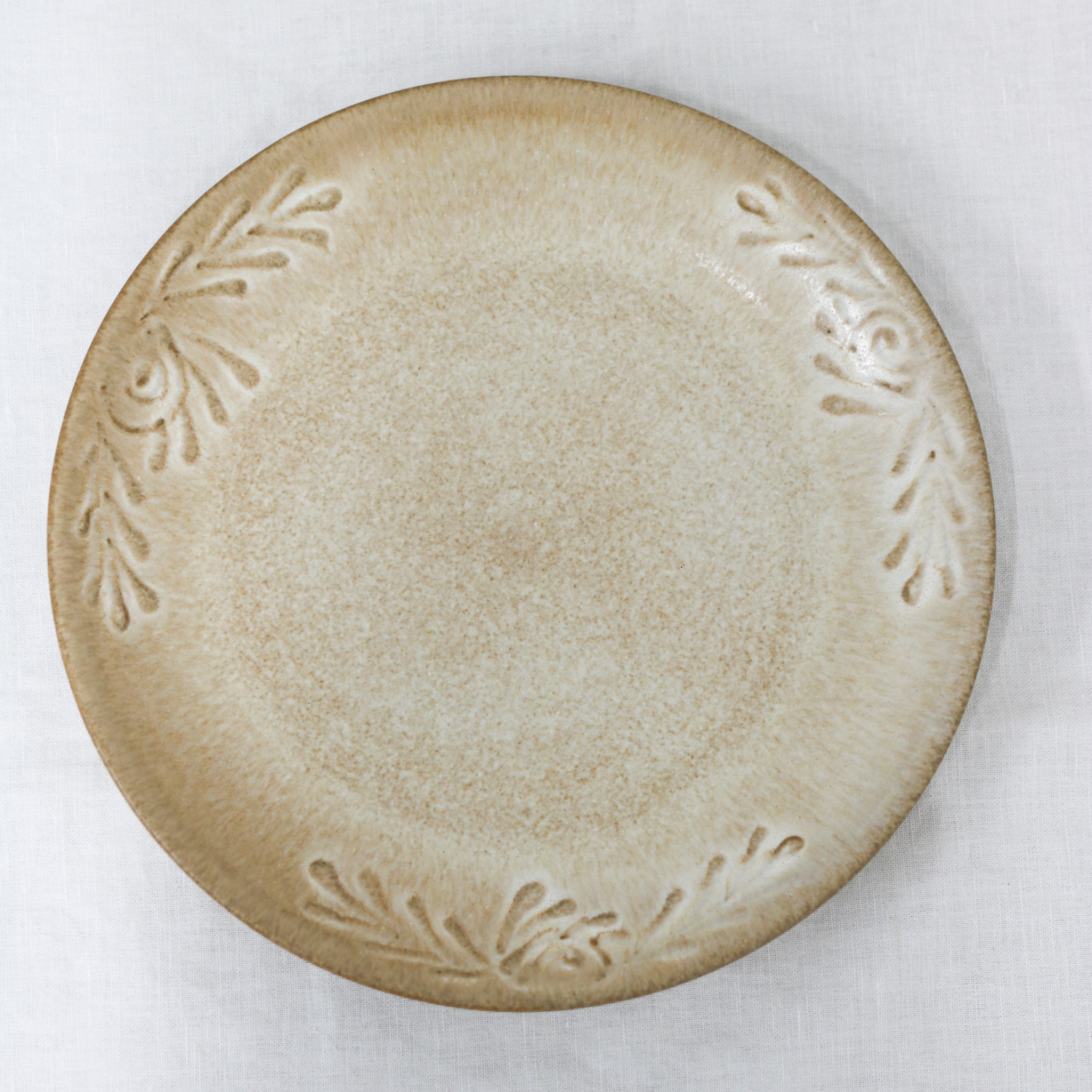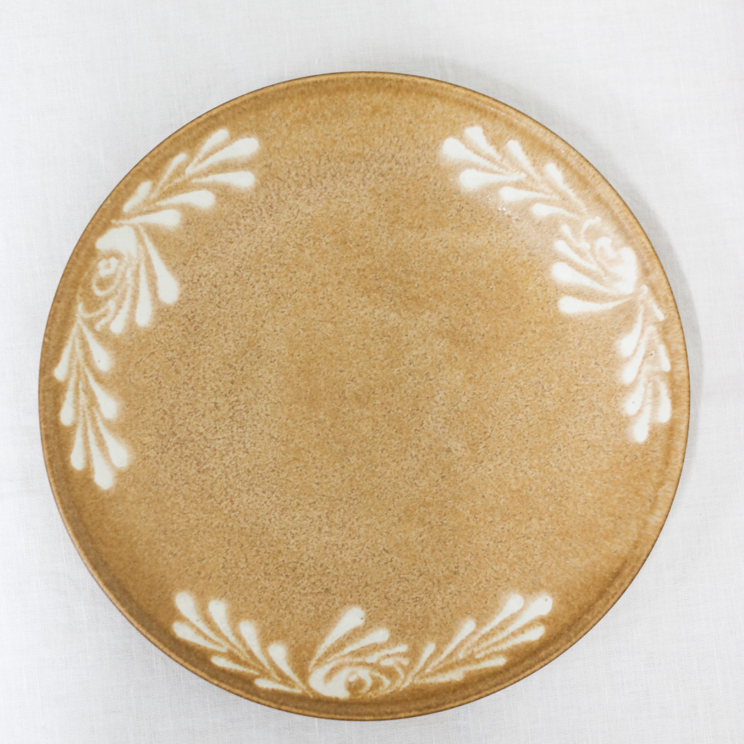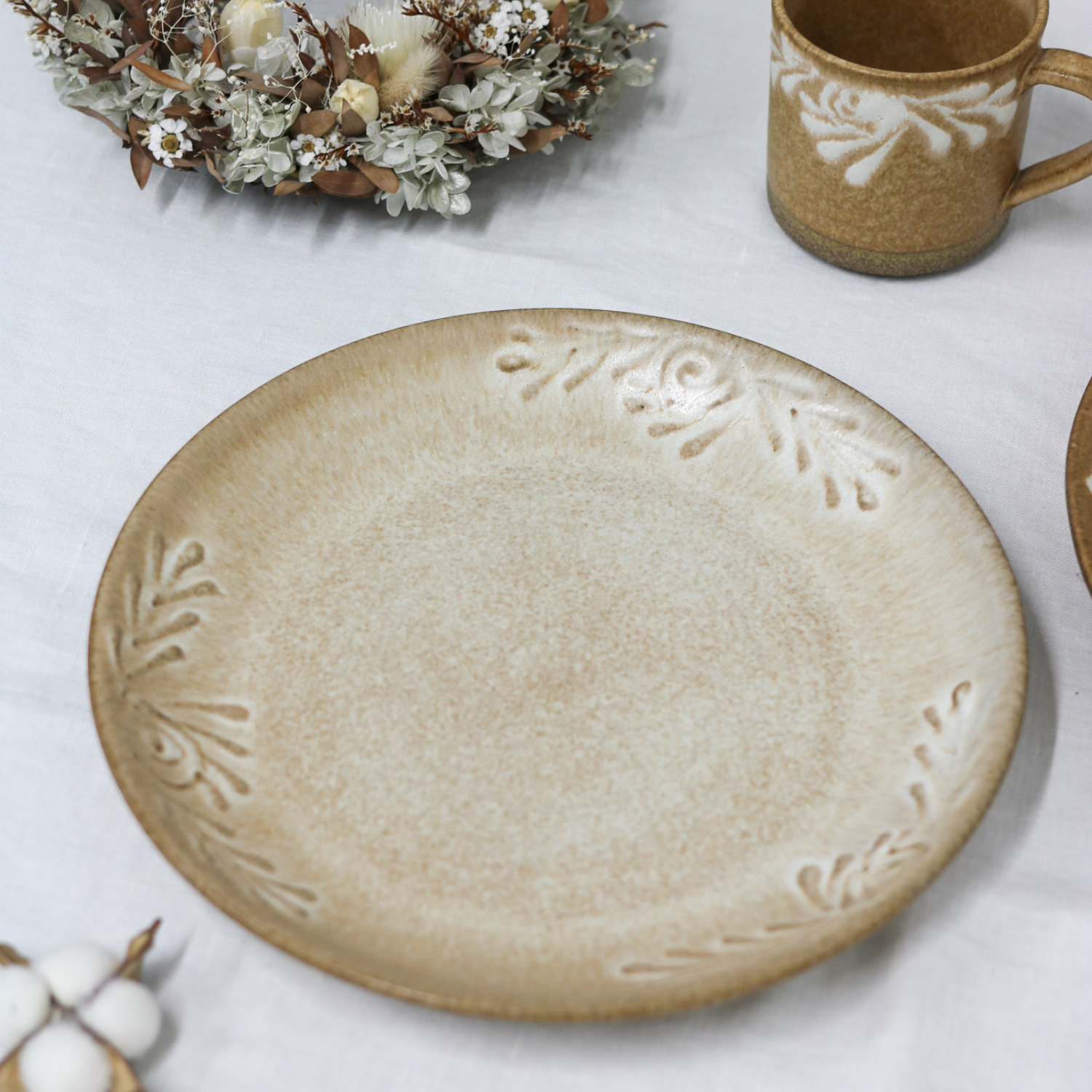 マットな釉薬と落ち着いた色味、釉薬がかけられず残っている素地の部分とのコントラストもステキなプレートとカップです。リースのような模様も丁寧に施され、ほっこりあたたかい気持ちになれるうつわです。パンや焼き菓子などの同系色のものと合わせても映えるので、カップにはコーヒーを淹れて、ステキなモーニングやティータイムをお過ごしください。