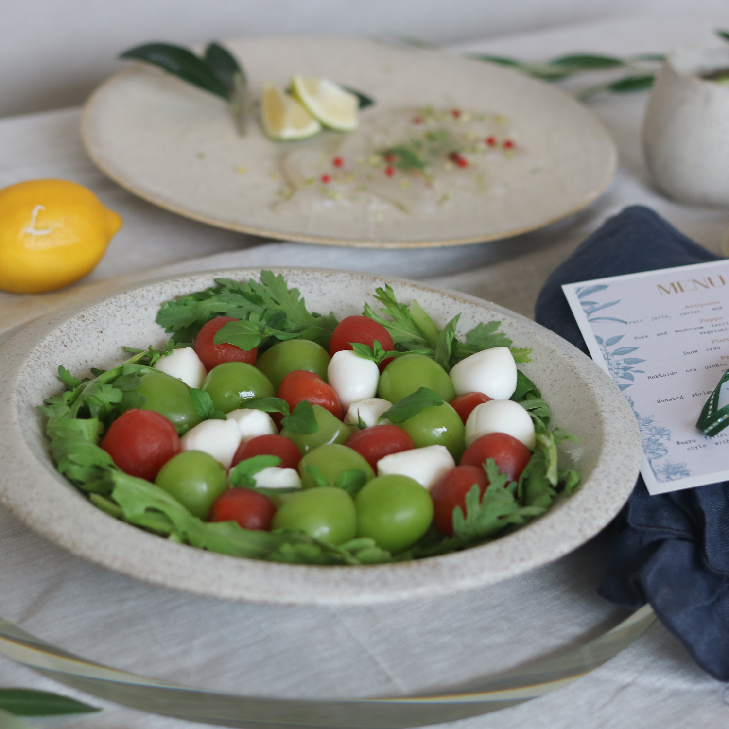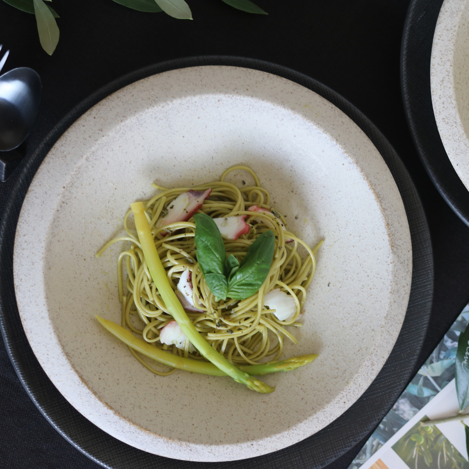 ぽってり丸いリムはどこかかわいくあたたかくもあり、エッジが効いていてスタイリッシュさもある現代的なうつわです。パスタ皿という名ですが、メインのお料理もOK。主役を引き立ててくれます。また、深さがあるので、スープや煮込み料理にも。