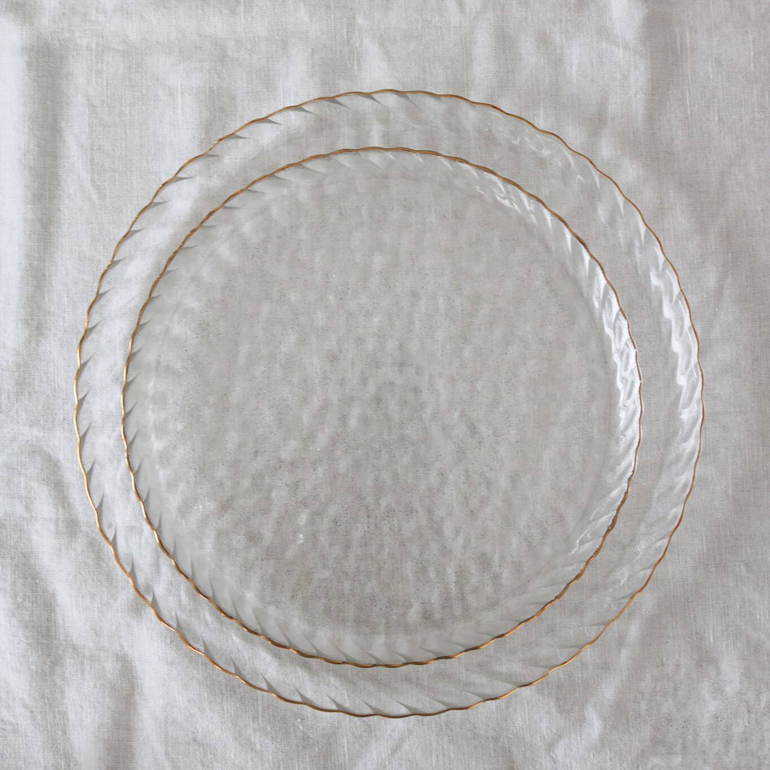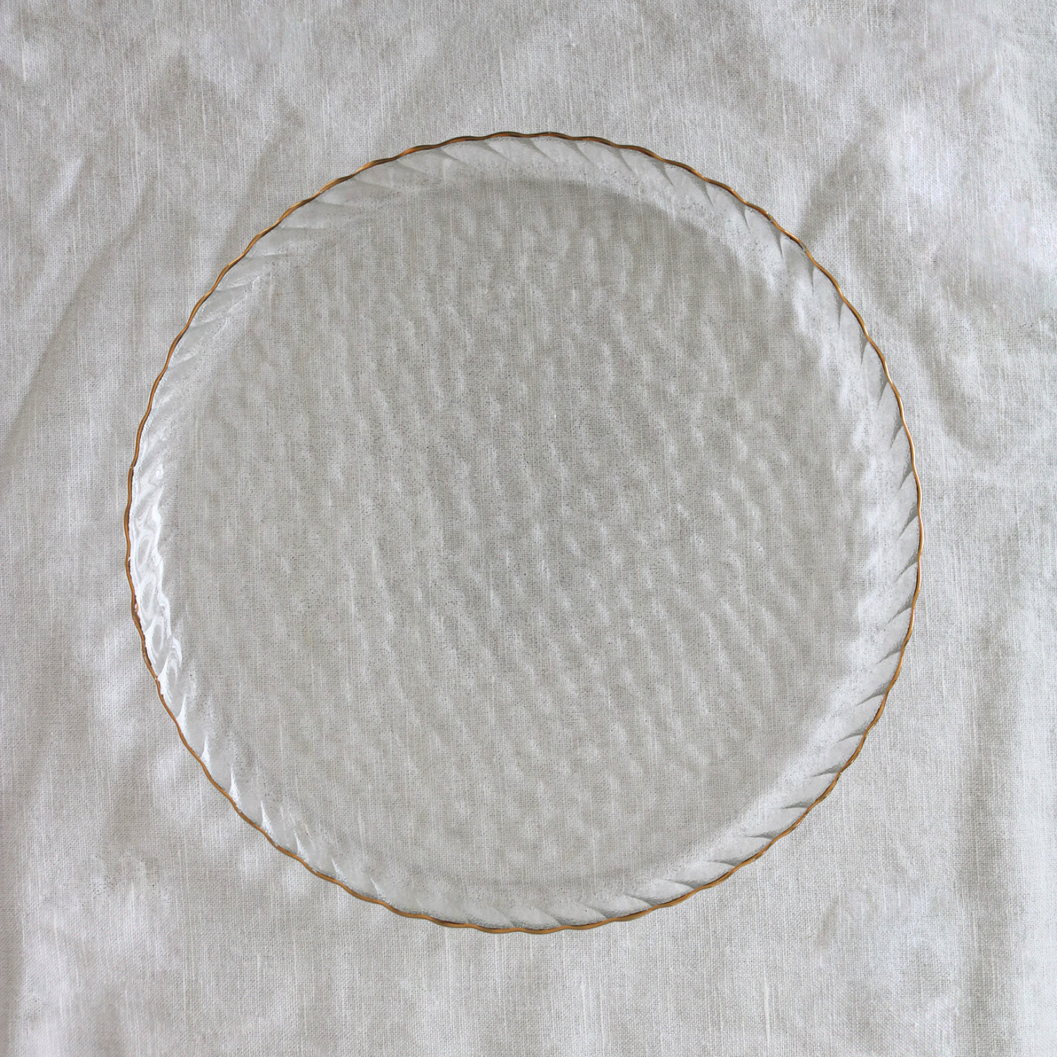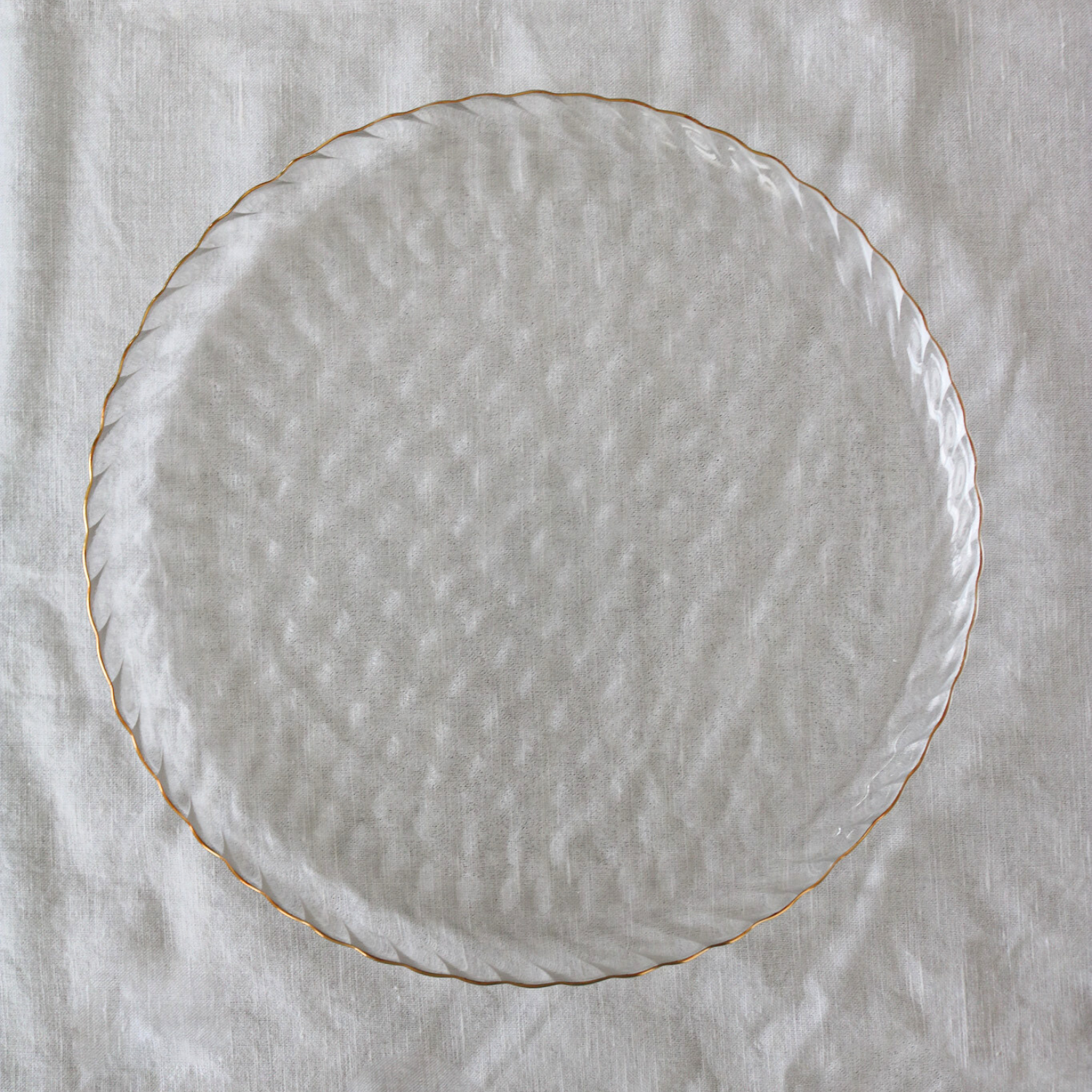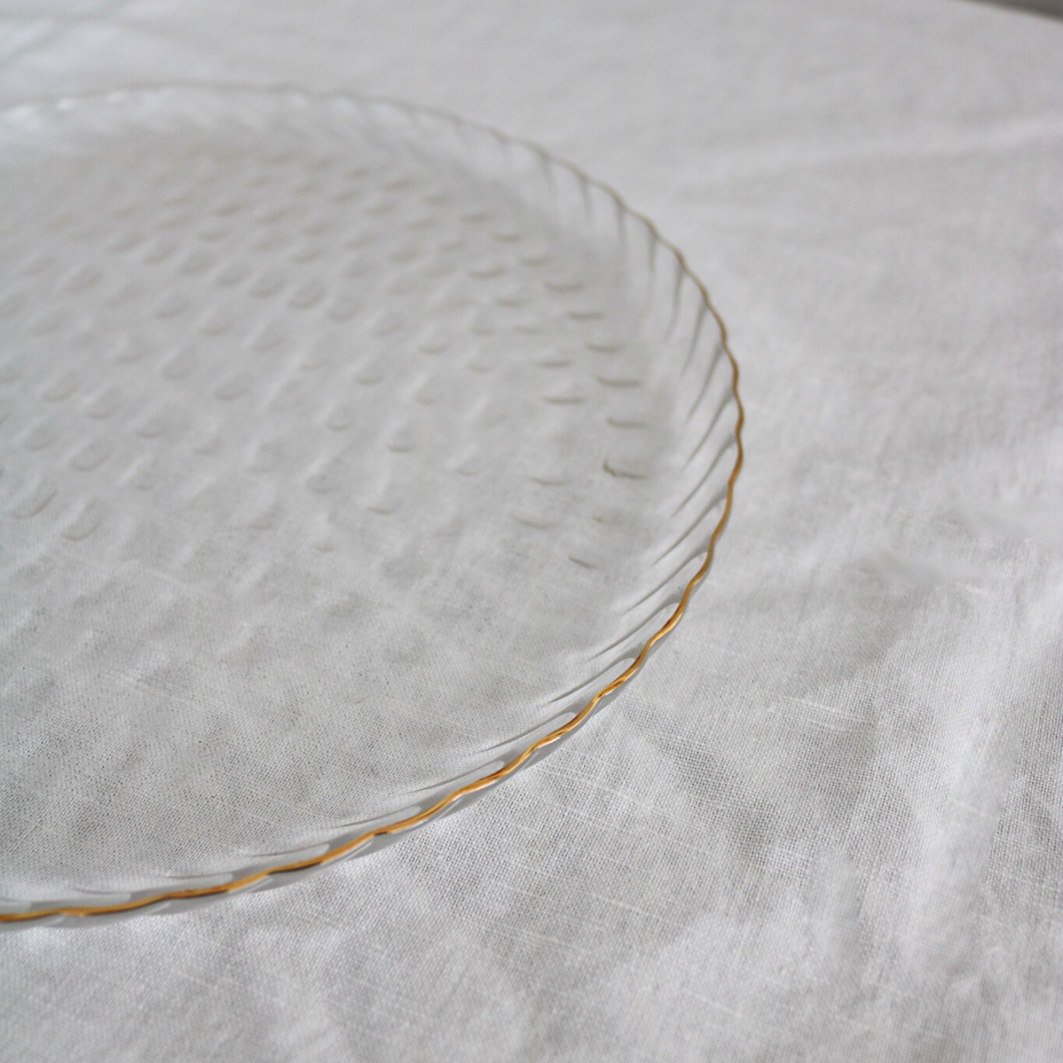 ガラスプレートですが陶器のようなフチのひねりとうろこ雲のような模様が手作りのあたたかみを感じるデザイン。フチの主張しすぎないゴールドがさりげないアクセントになっていて上品なうつわです。
