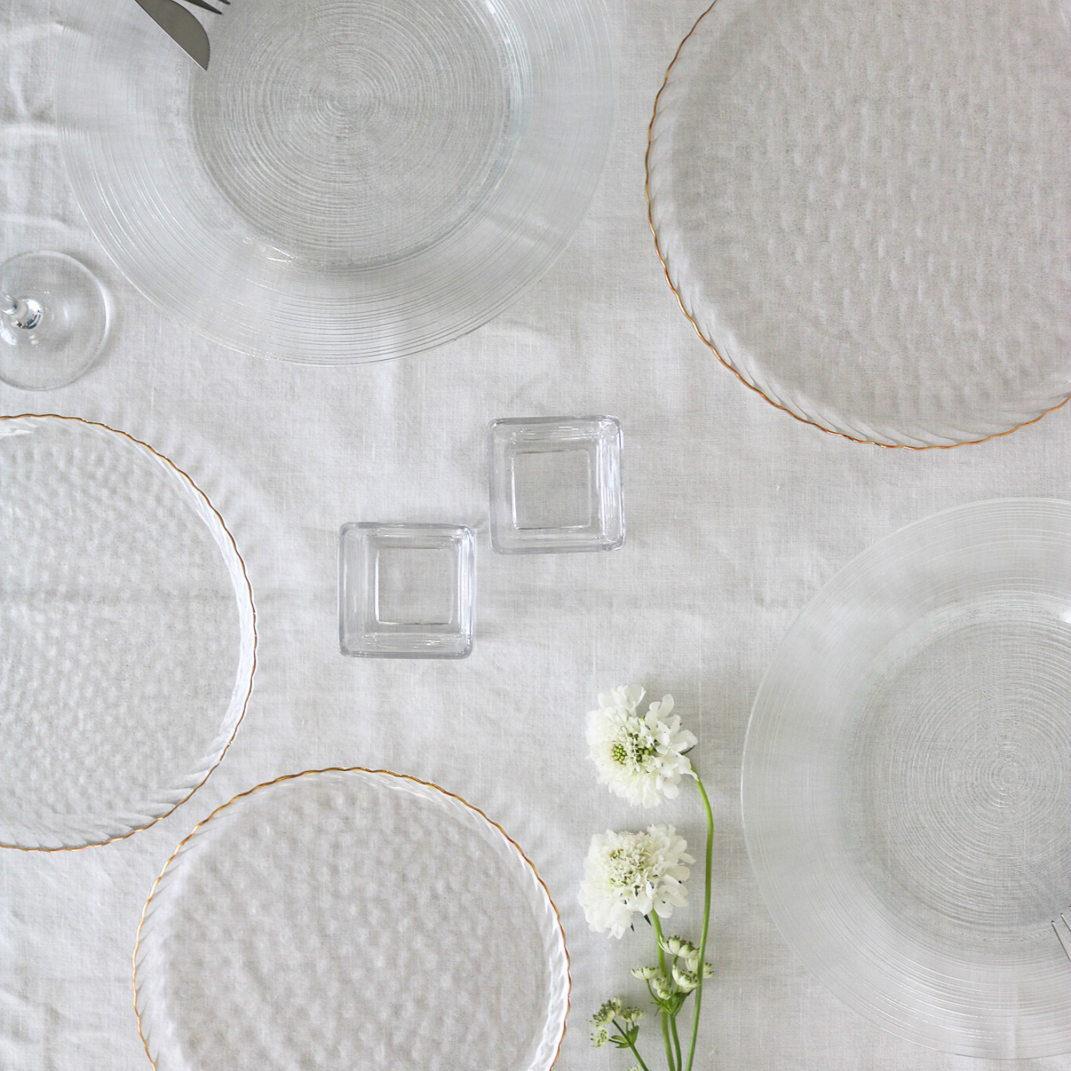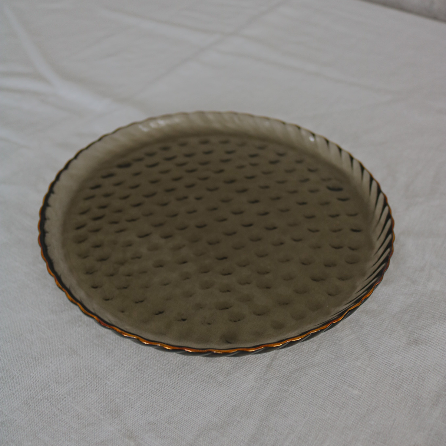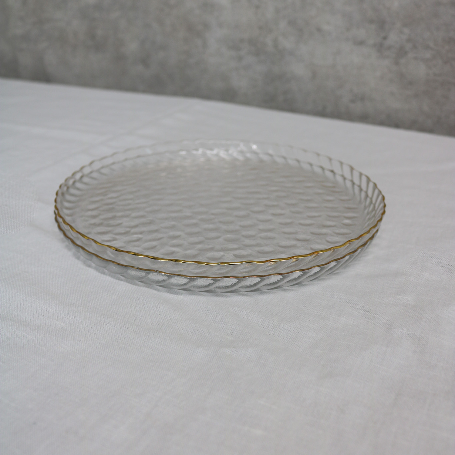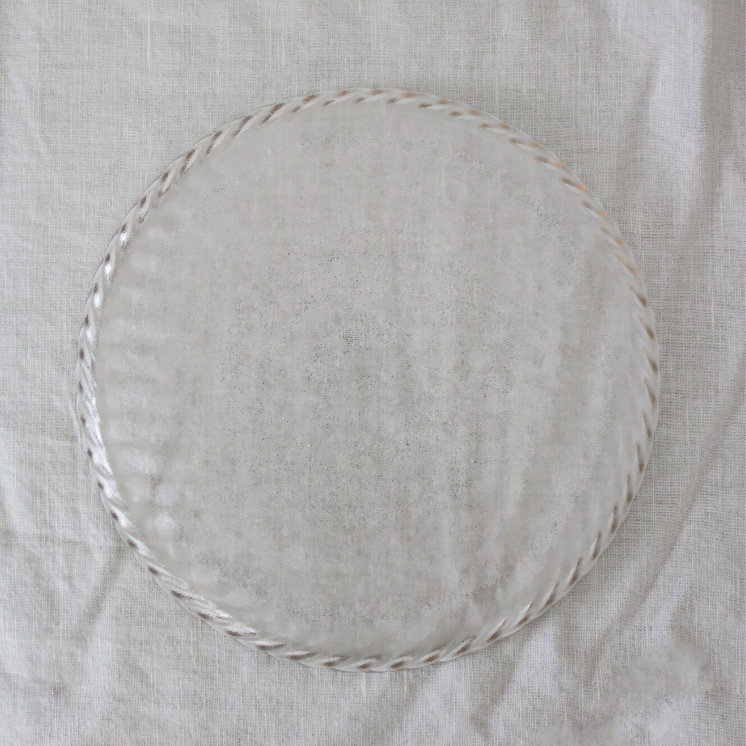 ガラスプレートですが陶器のようなフチのひねりとうろこ雲のような模様が手作りのあたたかみを感じるデザイン。フチの主張しすぎないゴールドがさりげないアクセントになっていて上品なうつわです。
