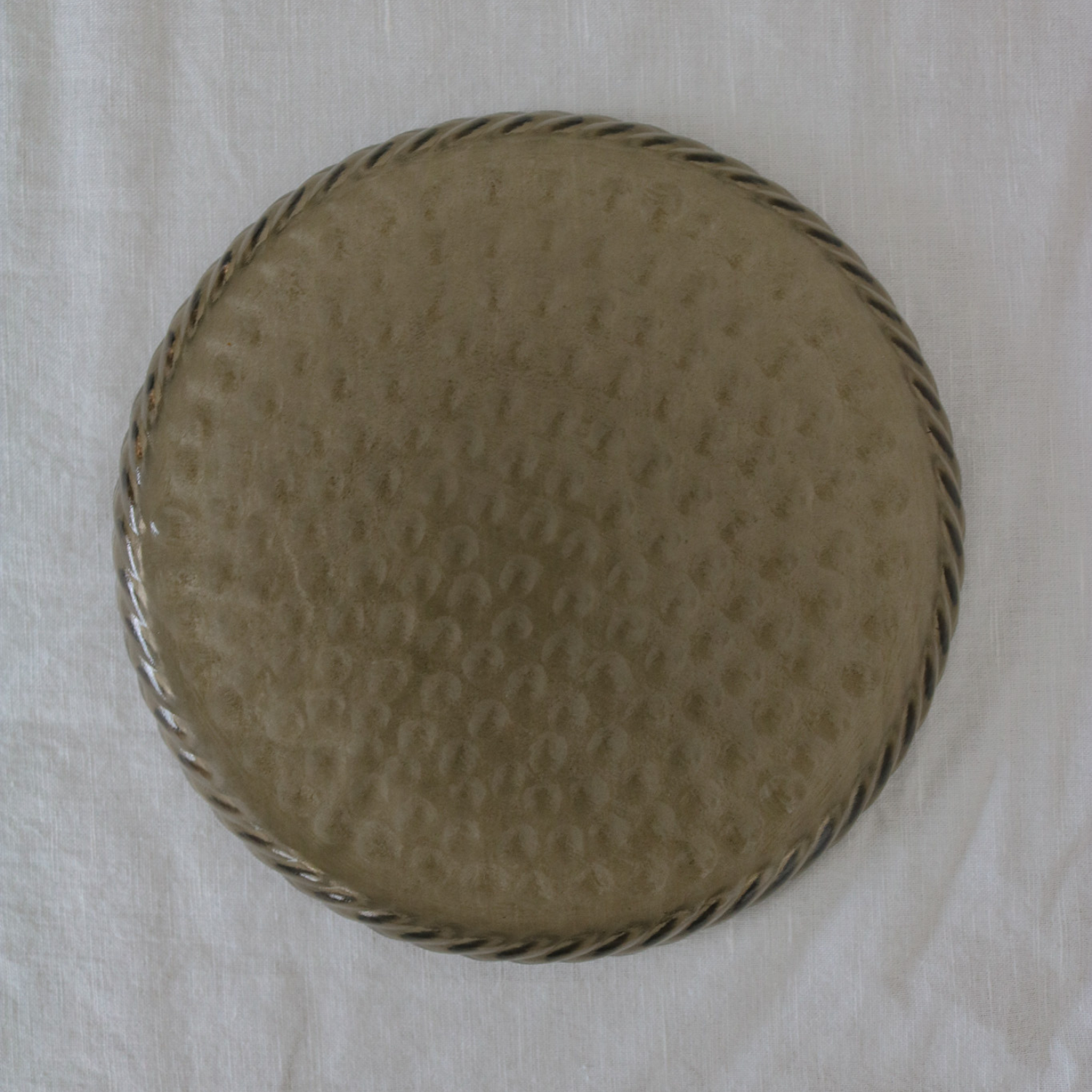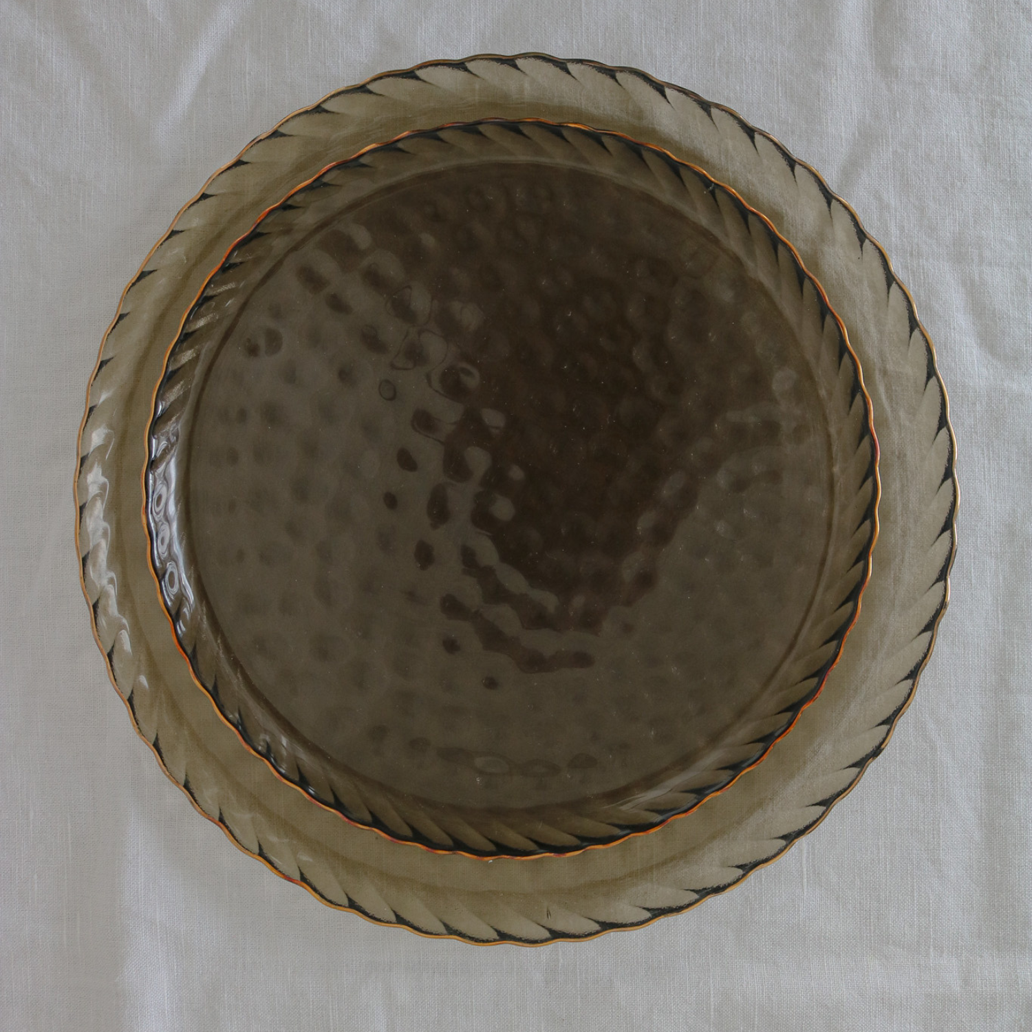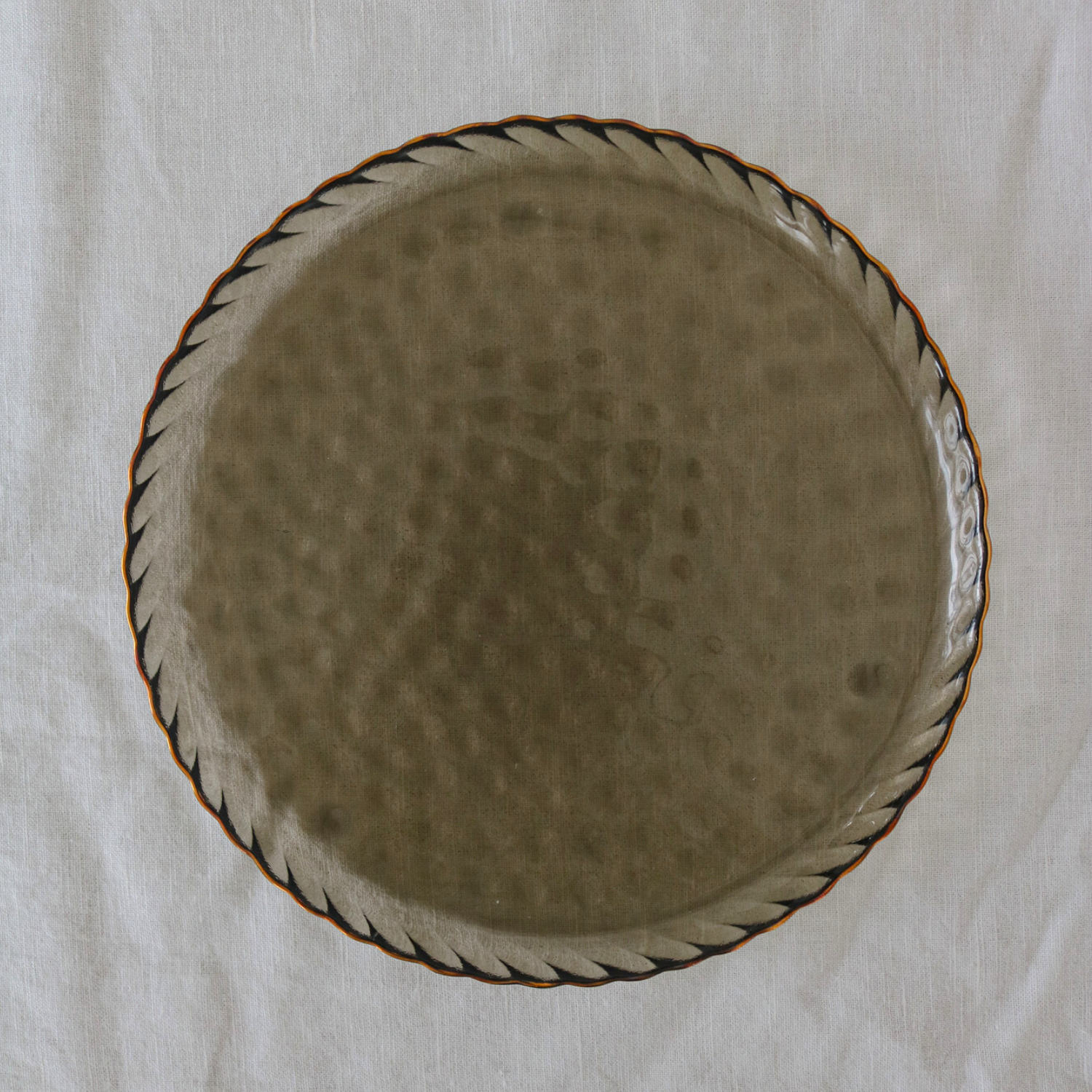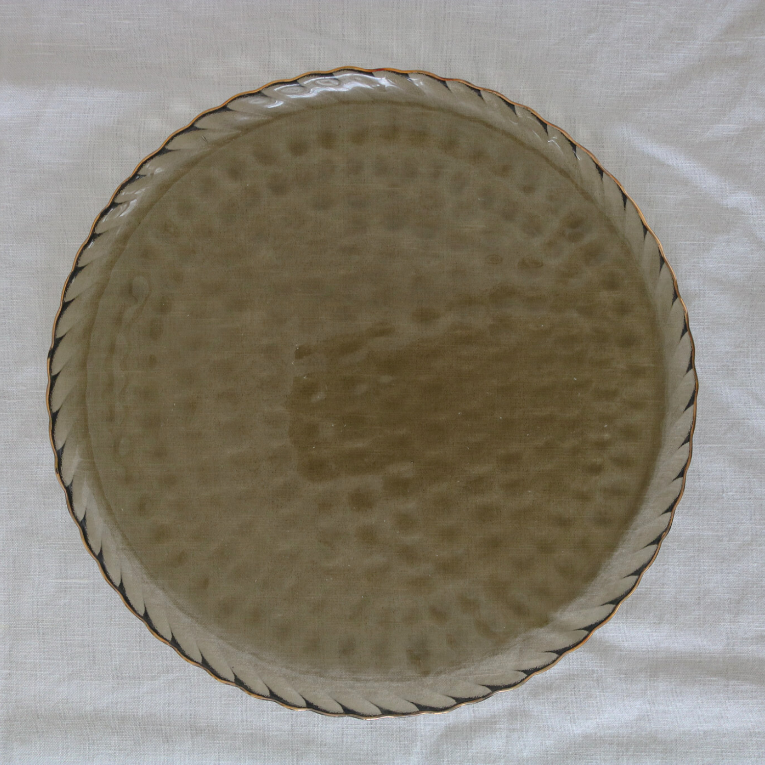 ガラスプレートですが陶器のようなフチのひねりとうろこ雲のような模様が手作りのあたたかみを感じるデザイン。フチの主張しすぎないゴールドがさりげないアクセントになっていて上品なうつわです。