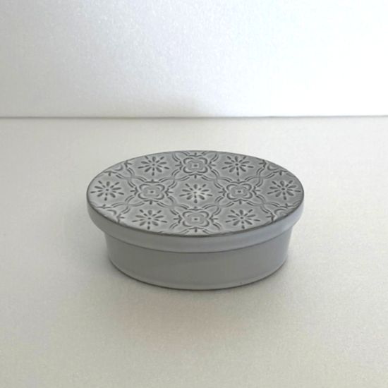 オーバルの形状に花の刻印のある蓋。