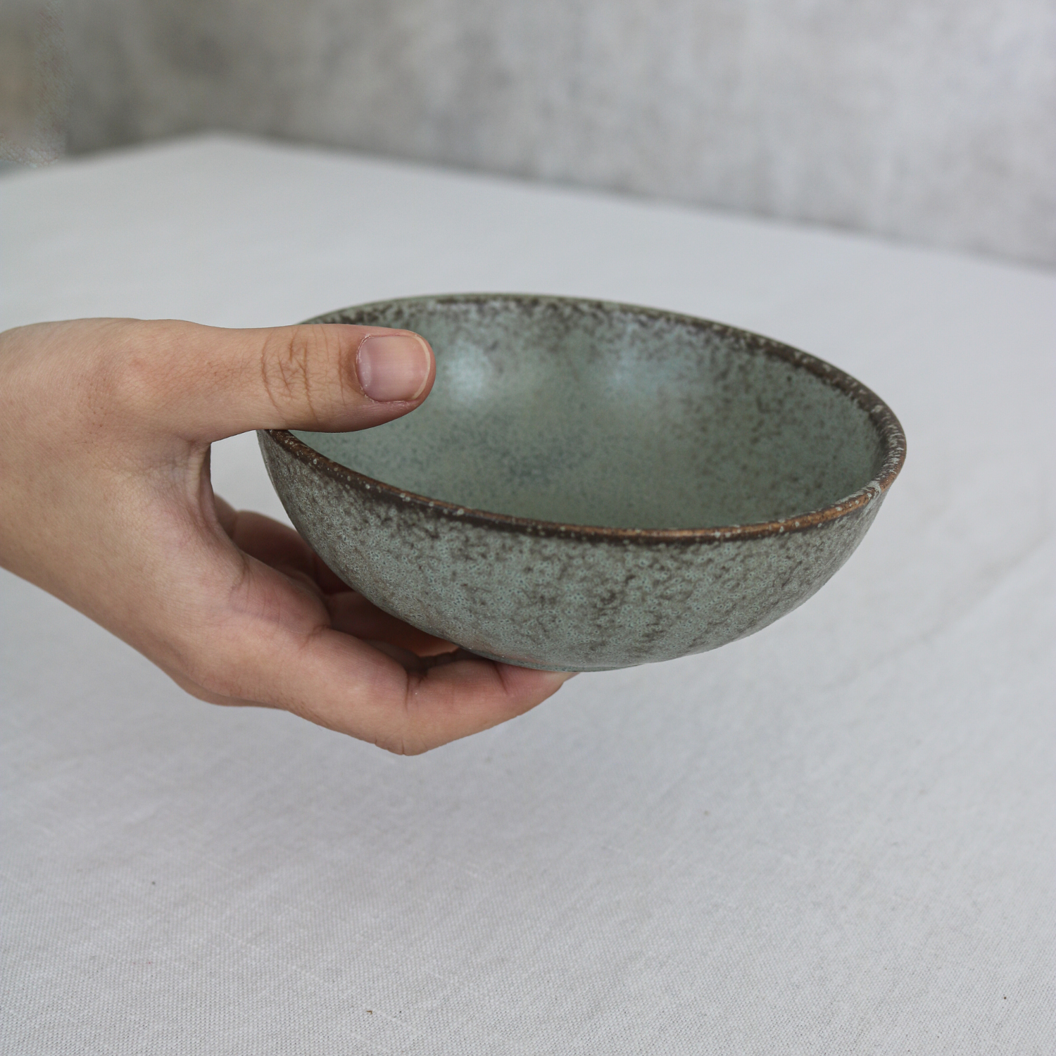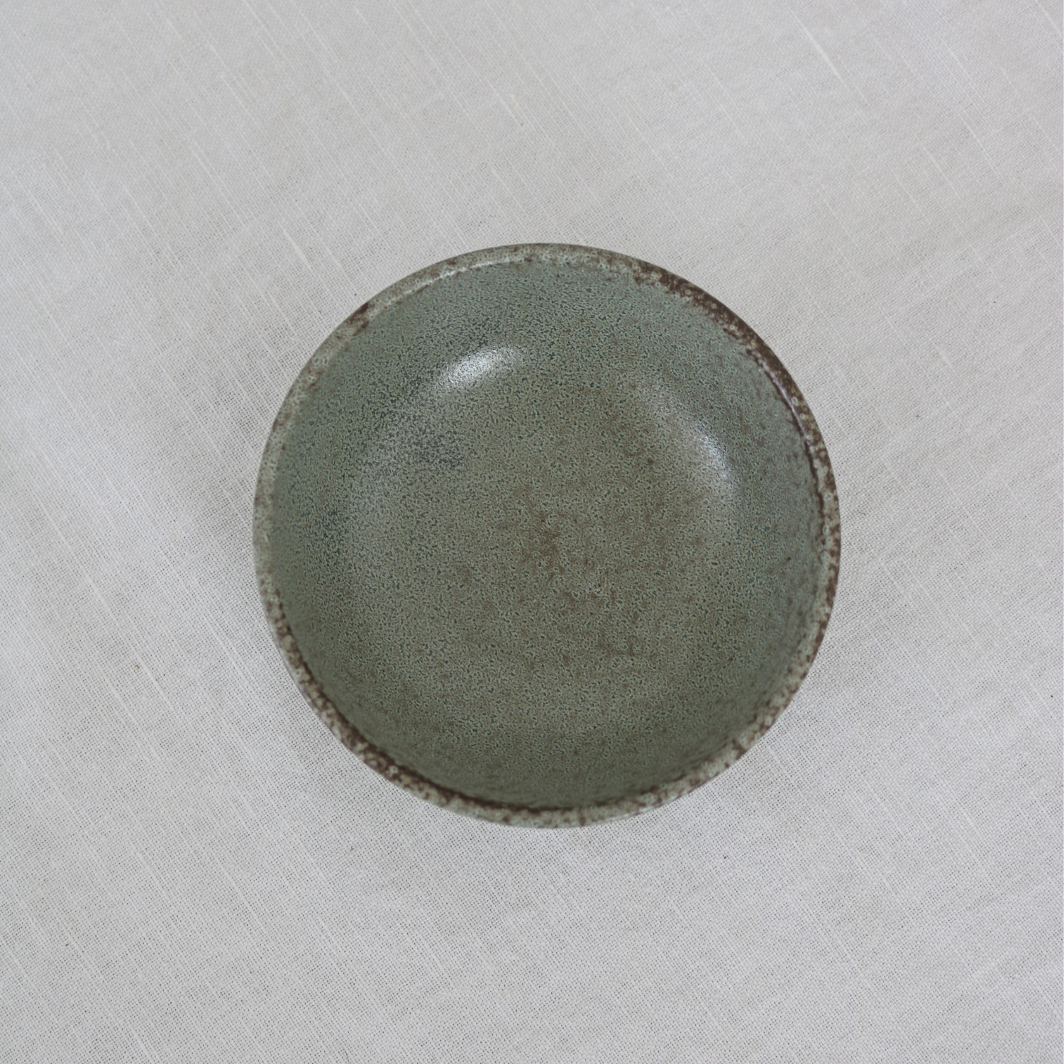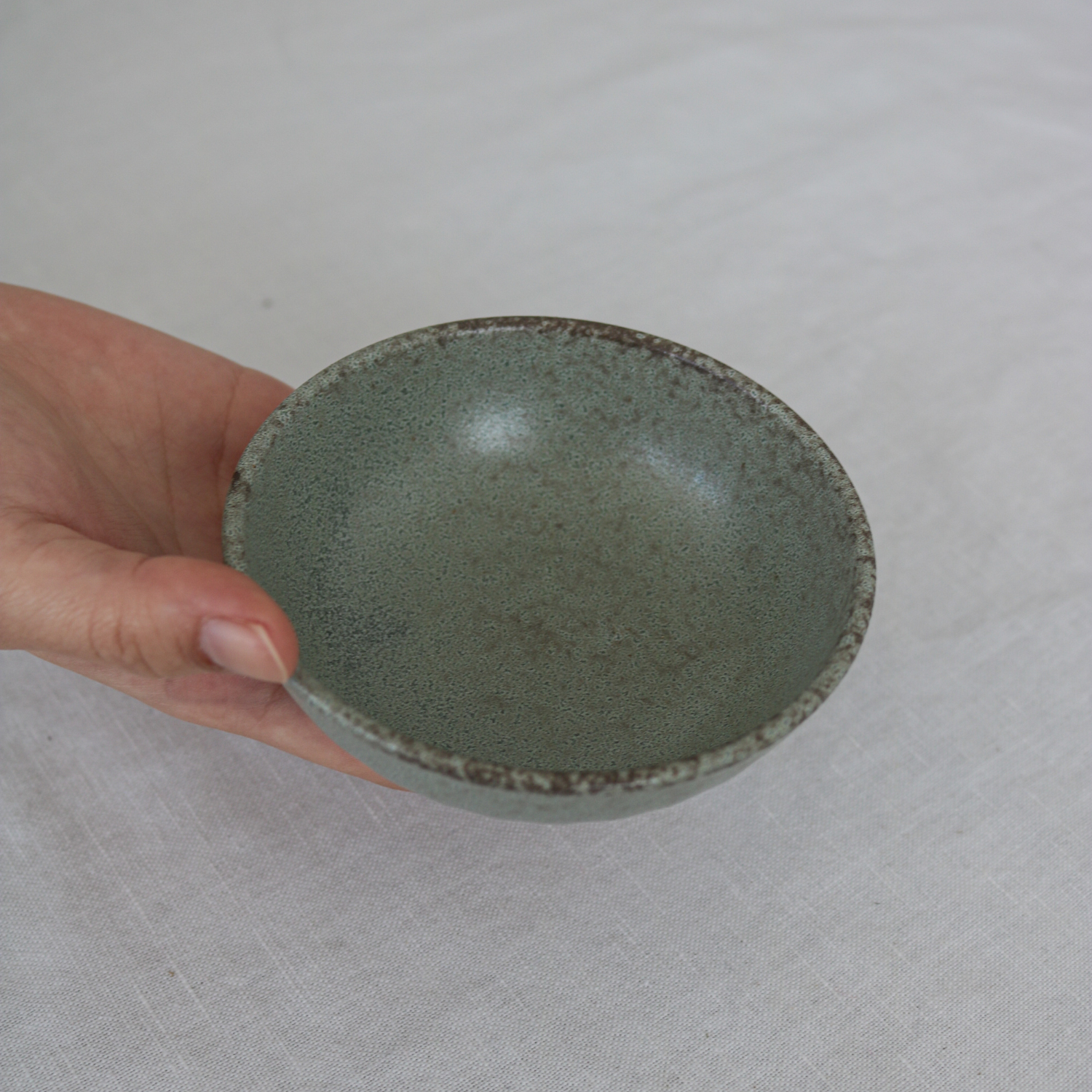 前菜用の小鉢、おつまみを盛るのにちょうど良い、ニュアンスカラーのミニボウルです。 グリーン系のグレイッシュな独特の色味は。よく見ると緑ががったグレー、青みがかったグレー、サビ色、色々な色の集まりでできています。